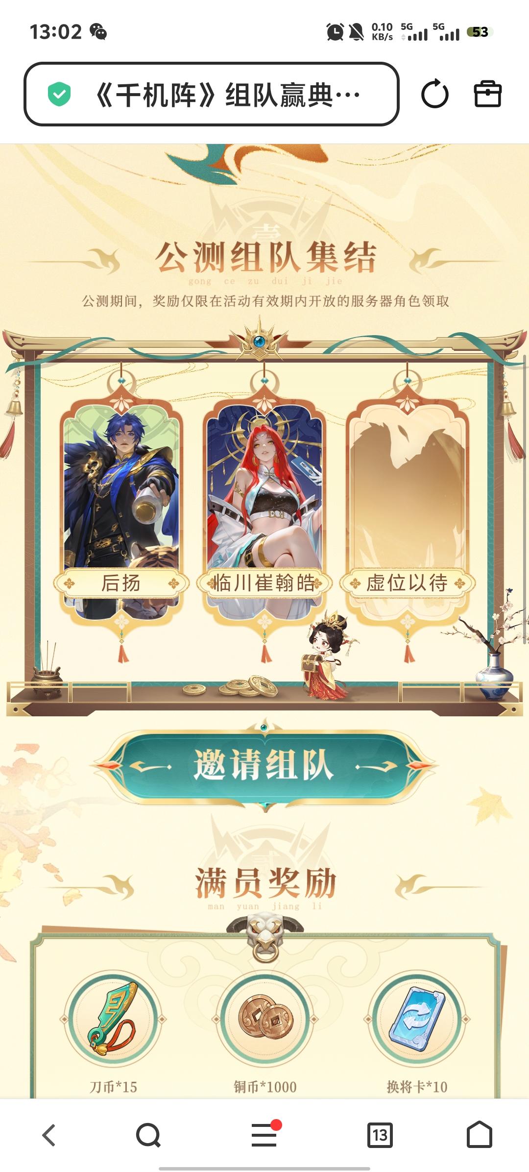 《千机阵》公测组队抽典藏皮肤100 抽。 我这儿2缺1,点一下就行,咱俩能不能当欧皇就看这一波了https://qjz-team.joymogame.com/team/?phone=15065226591&team_id=2r5605&nick_name=%E5%B8%A6%E6%96%B9%E4%BE%AF%E4%BF%8A%E6%9D%B0
