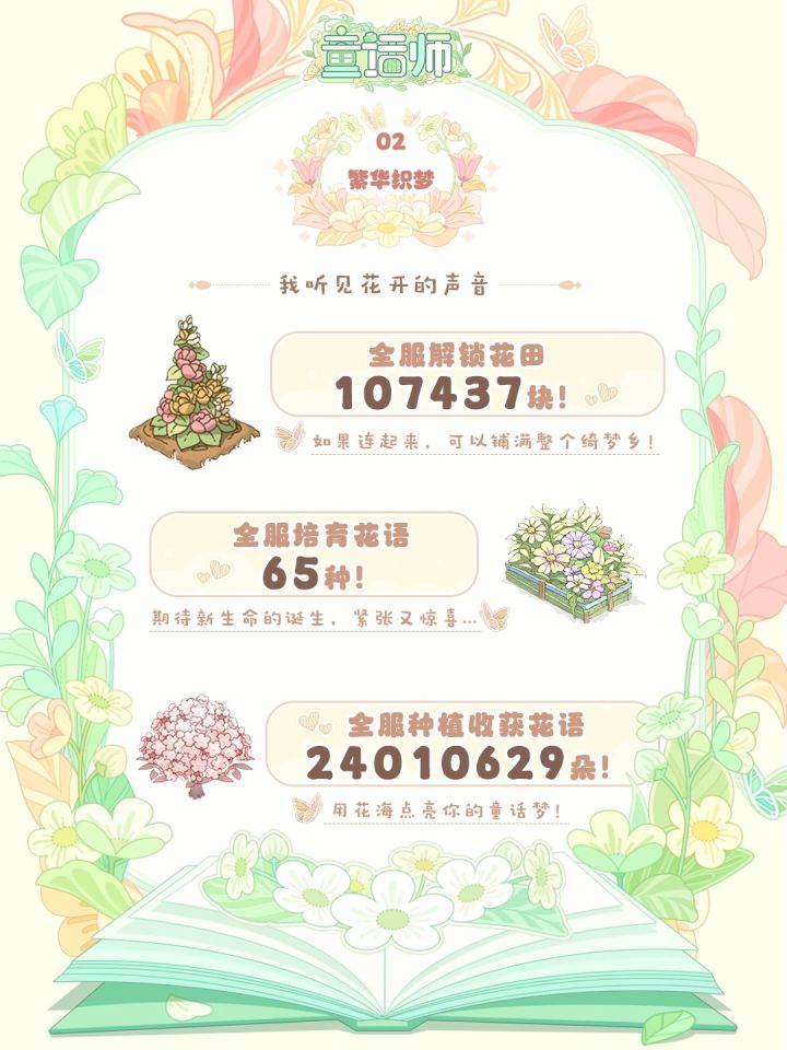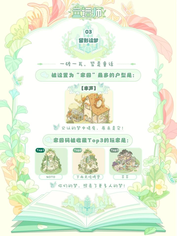 首测结束的第4天,想大家……整理测试数据的时候,大眼猫的眼泪要不争气地流下来了(绝对不是因为Tim不给买罐头),而是因为,原来在这几天里:🌟 我们一起度过了27208小时的时光!🌹 你们种出的花海,收获了2401万朵花语!🔨 你们搭建了11487个梦想中的家!还有更多有趣的“秘密”藏在图片里👇✅ 哪个户型是公认的“梦中情房”?✅ 谁的家园收获了最多童话师的收藏?✅ 你