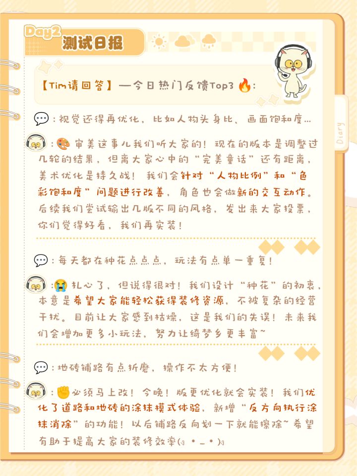 不知不觉,【扉页测试】已经开启2天啦,这期间我们收到了非常多有价值的建议与反馈!今天,童童邀请到了Tim针对各位童话师们在社区和玩家群里反馈最集中的几个问题进行回复与解答,让我们一起来看看吧!📅 Day1 测试日报 【Tim请回答】——今日热门反馈Top3🔥:💬 :种花好久,想早点装修都没机会/(ㄒoㄒ)/~Tim:🙏感谢反馈,这是我们项目组最大收获之一!我们一直在思考,如何更好处理经营v