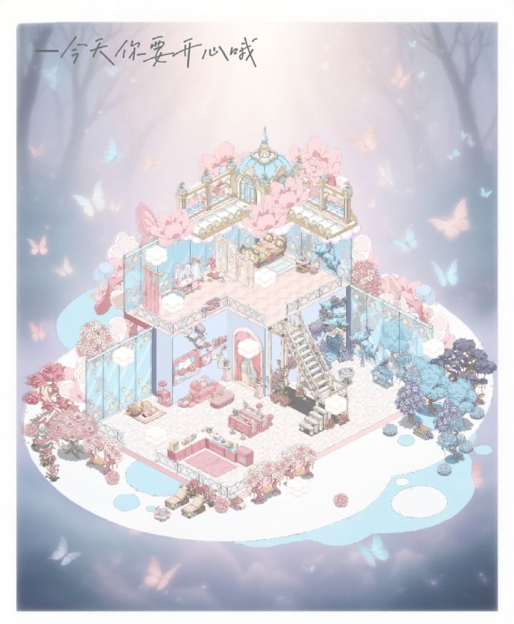 粉蓝童话城堡悬于梦境,彩蝶绕着雕花穹顶,软萌沙发与旋转楼梯翩飞,翅尖拂过精致的梳妆台与云朵装饰,把温柔的好梦揉进城堡的每一个角落。 蝴蝶落处,便是甜梦抵达的时刻。#发现好游戏 #童话师