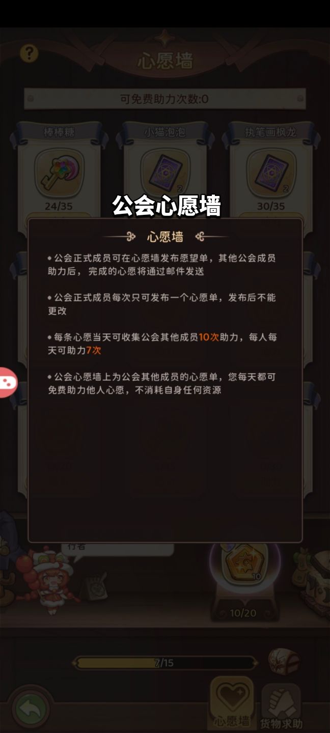 工公会心愿墙在你加入公会后的一个玩法,可以选择一个奖品进行祈愿,祈愿完成后便可获得该奖励,不同的奖励所需助力次数各不同,每人每天可以助力心愿七次(无法给自己助力),每天最多被助力20次,由于每个人每天只能助力7次所以心愿奖励还是比较难获取的,如果工会人少的话,或者工会成员不愿意给你点心愿墙则可能一个星期或者更久都拿不到奖励。 最有效的办法是在你开区时创建三个小号,进入同一个公会给自己助力,但是如