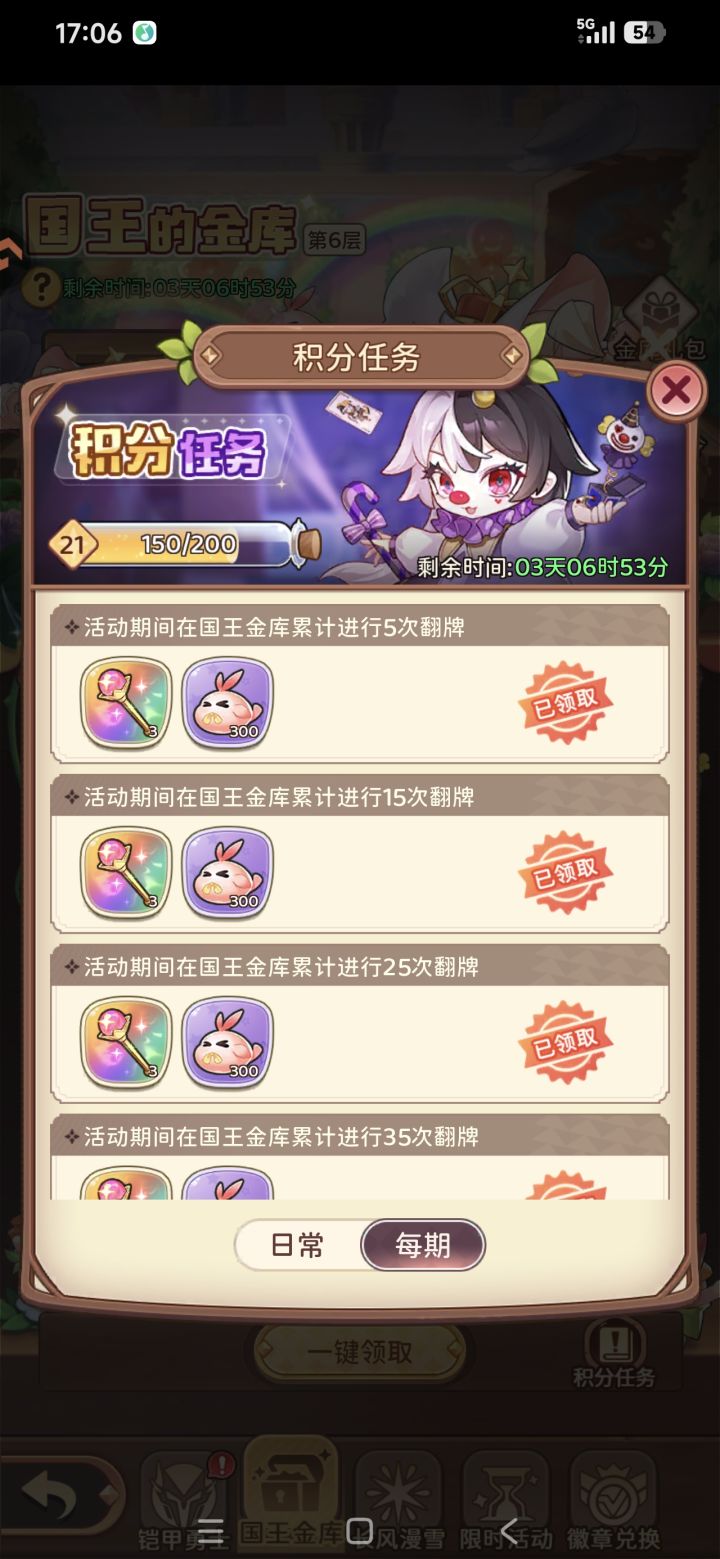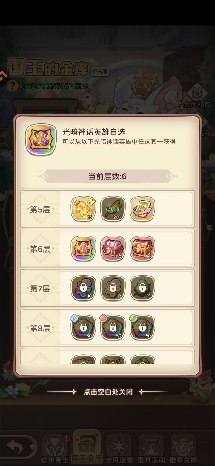 #冒险守护攻略 第三周国王68元有概率(光暗自选,幻灵,宝物)三选一,买了68元的战令后先用钻石升满战令,再领取经验升战令, 这样会多得几个钥匙,我只氪了68就能拿到第6层,而且第7周也会出国王活动,这样拿第6层概率高。