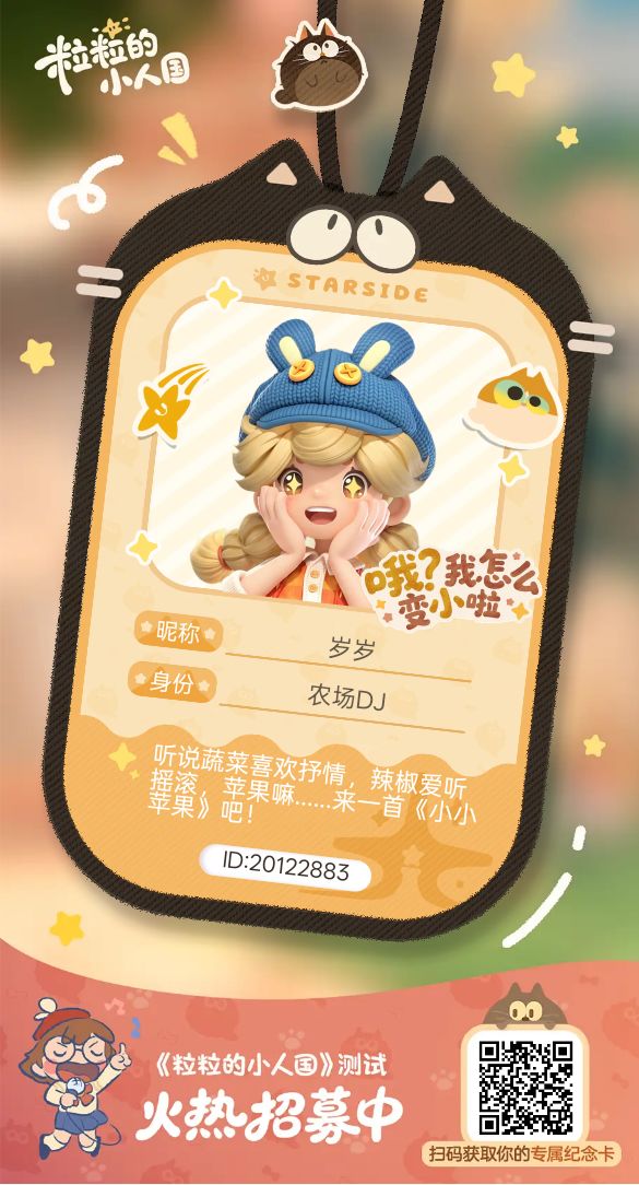 蹲蹲《粒粒的小人国》安家测试!真的被小人国治愈又可爱的画风狠狠戳中了,能倾听大树年轮里的古老故事这个设定也太浪漫了!已经生成专属纪念卡啦,希望能抽中资格,提前进入这个温暖的小世界✨ ID:20103814