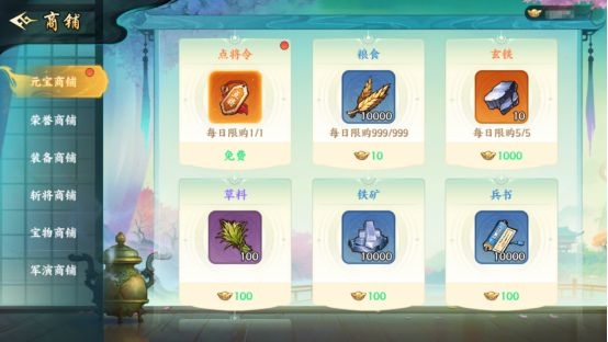 各位主公好,商店兑换是涵盖了比较齐全的武将、坐骑、美人、基础资源等丰富培养物资,商店的物品较多,但往往我们可兑换使用的货币道具是比较有限的,在这里带您看看如何兑换更加物有所值,让您不再眼花缭乱,来一起看看吧~ 1. 元宝商铺。可兑换物品:点将令、粮食、玄铁、草料、铁矿、兵书、铜钱推荐:每天的免费的点将令记得领,平时的日常基础资源粮草、兵书、铜钱,若是缺少可以考虑适当购买补充。 2. 荣