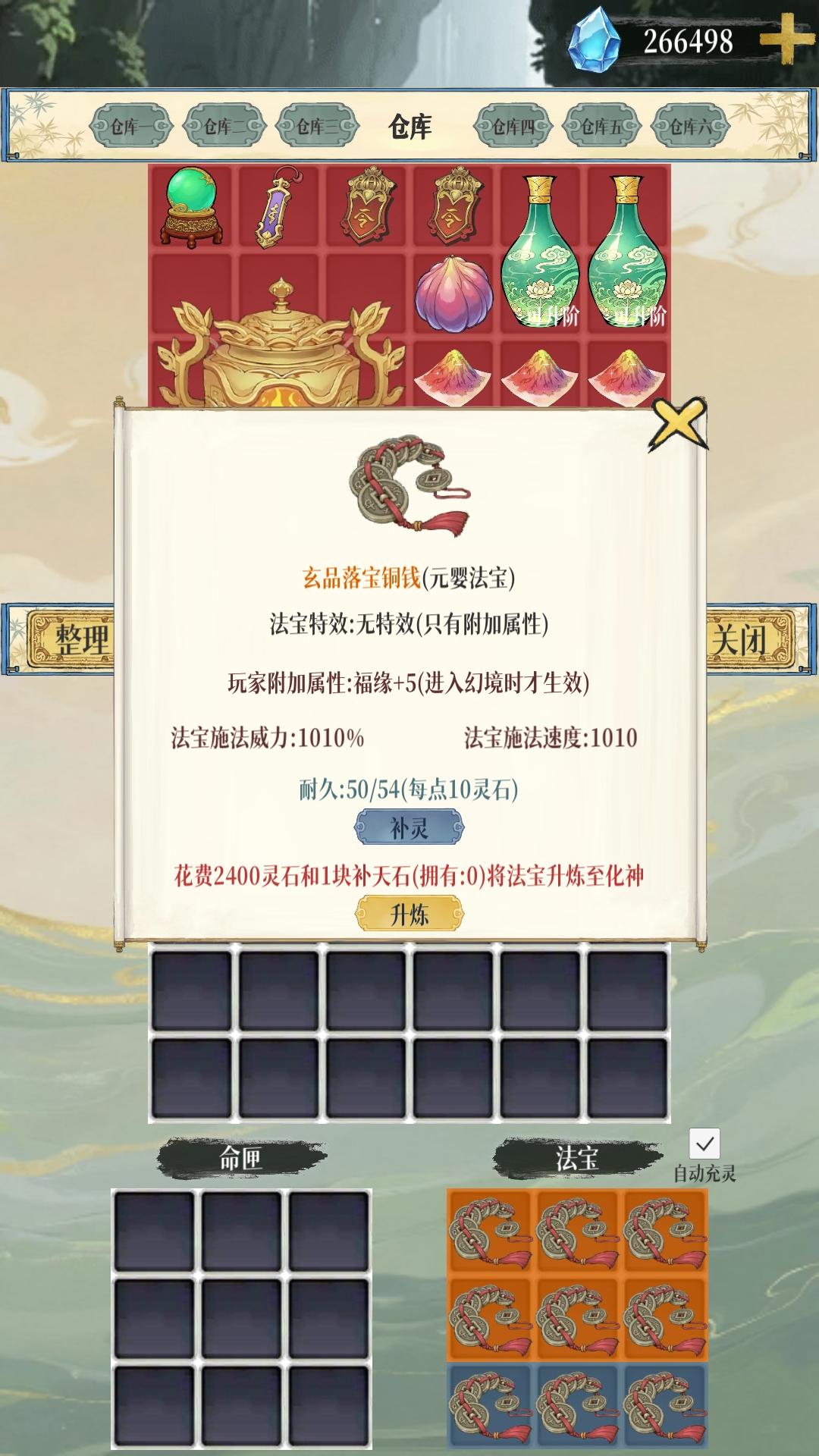 开局弄到落宝铜钱的图纸(我也忘了是不是开局自带的),然后装备直接满铜钱,要知道福源是最难搞的,可铜钱不一样,太容易了,可以自己合,也可以拍卖行直接买,很便宜。福源高了,出红出高灵石的几率也就高了。钱多了之后就如图点一下铜钱,再点属性就可以花钱升品质,品质高了之后铜钱耐久和加的福源也会多起来,到了筑基的图开始不升品质的话铜钱耐久就不够用的。所以我们做的就是“利滚利”只要铜钱品质高了,一句下来满红不要