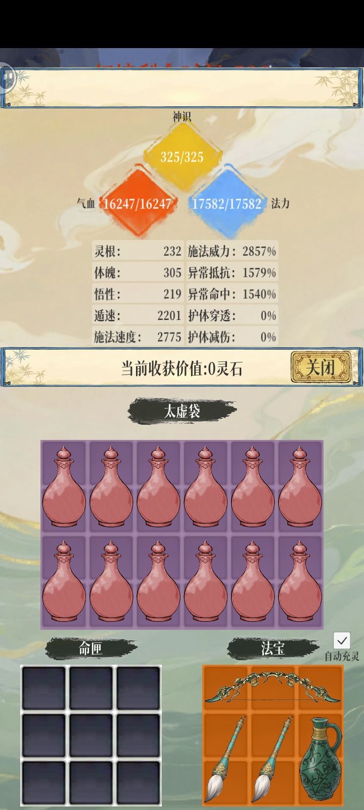 /功法术法如图所示,术法首位三气归来,中毒灼烧打伤害,天命点悟性与体魄(我喜欢用憾世龙锤体魄多点了)多点悟性呀!三千雷动可以叠雷符与上攻击次数,玄武异常状态难上。