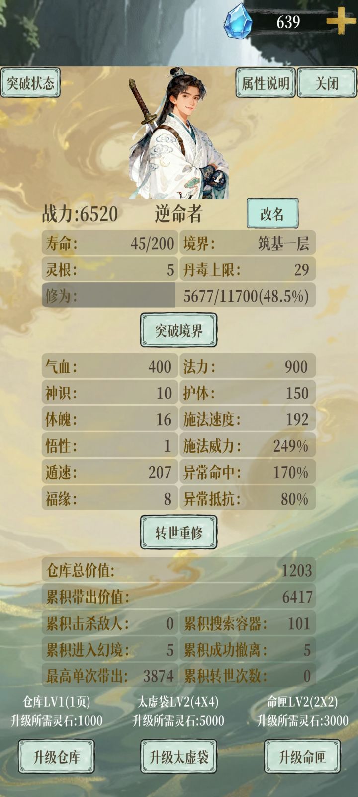 开篇说明:这个游戏是一次单线程修仙,每次刷秘境都是绝对有提升且提升无上限的,所以千万不要拿存档功能浪费时间。不过存档功能算是比较重要的功能了,每次刷秘境清理物品后必须先存档一次,免得不小心退了后丢失数据。(这里吐槽一下,删除存档按钮放得离清空背包按钮这么近是欲何为?每次清理背包都非常担心误触后手快清存档)简单介绍一下这个游戏,花费寿命进图,搜物资,打架,撤退。寿命将近时可以转世重修,重修只清除
