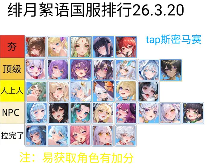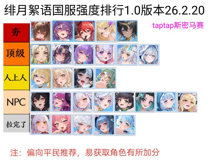 大家好,我是斯密马赛,锐评一下当前版本的角色强度光盾火奶依旧坚挺,当前版本最强奶和盾的含金量不减。火灵绯获取简单,强度不低,老区都要开第四轮复刻了,平民依旧是最好的主c选择。路西法毫无疑问的t0,超究极版莉莉丝,配暗队和火队上dot,输出炸裂。云韶一些小问题修复后,已经是纯数值怪大人猫狗依旧平民福音,但是在同时抽了大量限定角色的玩家手里,只能去二队了其他限定c池子已经过去,现在强度下滑