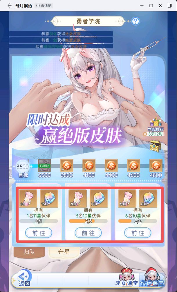 大家好,我是斯密马赛,更一期萌新入坑指南进游戏第一件事:跑区,为什么跑区,非酋和欧皇差距巨大,如果能够第一天抽到当期up,相当于比非洲人多120抽,也能去找找有没有新区双簧的初始号,对于氪佬来说比较划算。【主线篇】1,先去推图升级,第一天升级非常快,有钻石了先把「探索特权」开了,保持每天先推图再用钻石买满冒险,早日升到100级,把玩法全部解锁。2,「伙伴密室」,「倾心之约」,「无限绝色」,