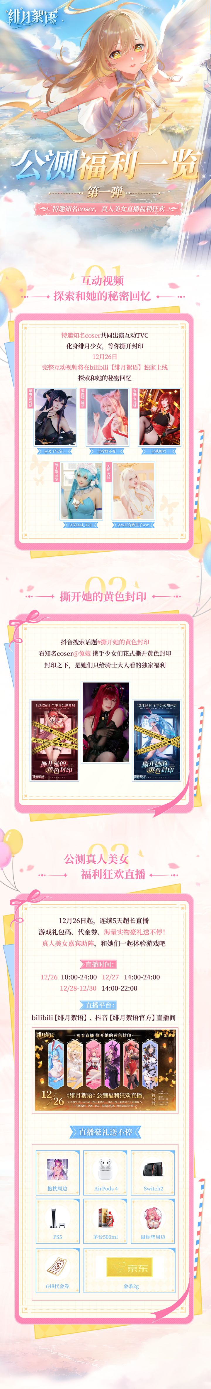 女神助阵,大饱眼福!超多福利袭来,随12月26日公测开启同步放送~🎬互动视频bilibili独家上线:特邀5位知名coser共同出演,请骑士大人做出选择,解锁和她们的亲密互动吧;⚠️撕开她的黄色封印:看知名coser@兔娘 携手少女们花式撕开黄色封印;🎁5 天福利狂欢直播:PS5、茅台、金条天天送!👇更多福利请看下图👇——指尖轻触,解锁她的私密絮语——美少女收集放置卡牌手游《绯月絮语》