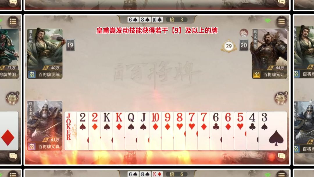 #三国百将牌 ##技能斗地主 # 【三国百将牌】皇甫嵩 ◆特点:防反、过牌 ◆技能简介:皇甫嵩乃汉末柱石之臣,屡建战功、平乱维稳,在《三国:百将牌》中化作技能【平乱】:包含自己在内的任意玩家打出的牌若均≤5,则皇甫嵩获得数量相等的≥【9】的牌。逆局破敌,化弱为强。 “旌旗所向,皆为齑粉!” ◆实战技巧: 皇甫嵩的初始手牌中有≤【5】的小牌且有多个≥【9】的三张时可叫地主。 开局优先打出自己