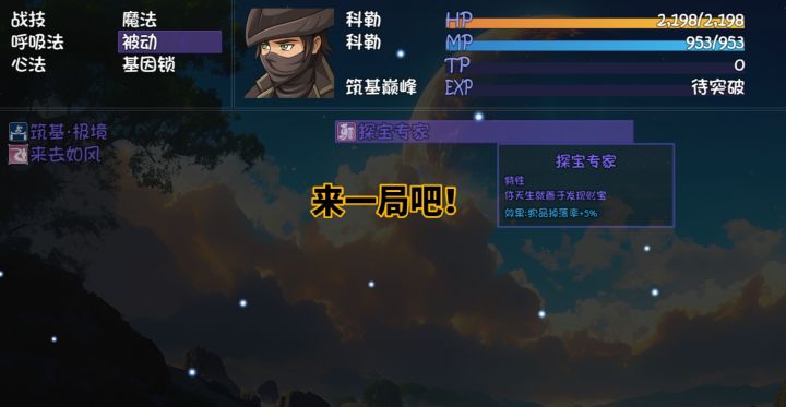 本篇攻略只要三村会武夺魁加入宗门给的筑基丹和心法,不需要门派技能和特殊物品。玩其他宗门和不同流派时,可以参考攻略流程把使用的技能和角色进行调整。因为这种玩法对装备的依赖程度低,所以在中期打怪输出会略显乏力(对比圣光教裁决系、魔法学院獾院这些肯定差远了),但这种玩法的优点是过度很平滑,能节约大量挂机时间,适合新手熟悉游戏中期流程。1.出新手村后去霜风平原完成抓兔子任务拿到装备幸运兔脚,顺便买1个兔