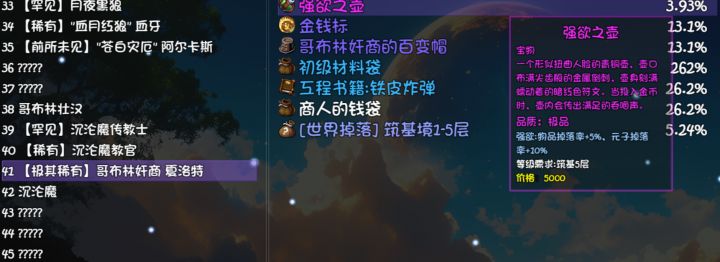 目前角色爆率基本堆满了(4女神4贪欲)128了,禁区毕业套也只有百分之5的概率,不敢恭维推荐大伙刷一套女神再挂机刷4贪欲,接着买禁区门派套,最后再买3女神,女神套能提升的几率真的有限,不如先提高伤害提高刷禁区的效率考古大师的铁铲 禁区霸王龙掉强欲之壶 窃语小径哥布林奸商掉落极品品质概率刷出神妙(寻宝)科勒需要一个强欲之壶换取