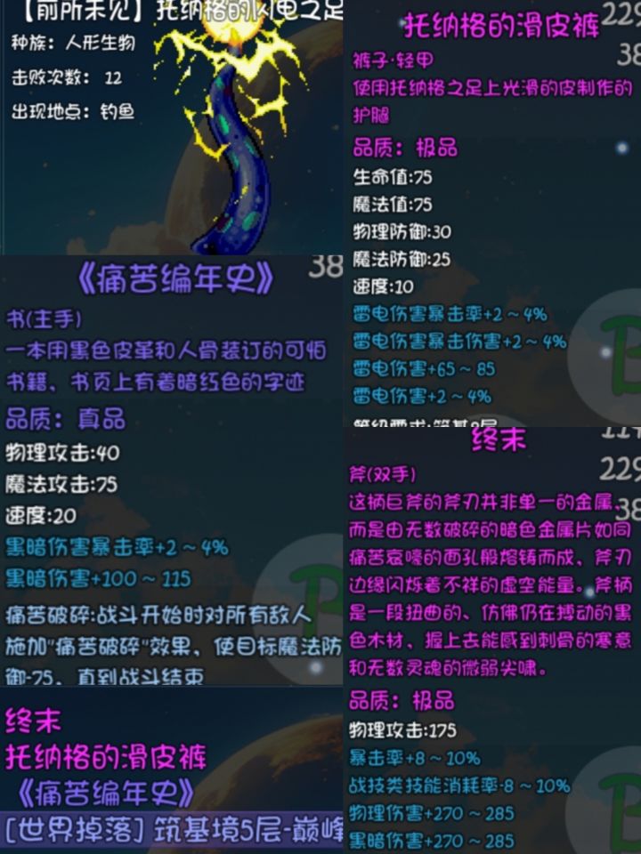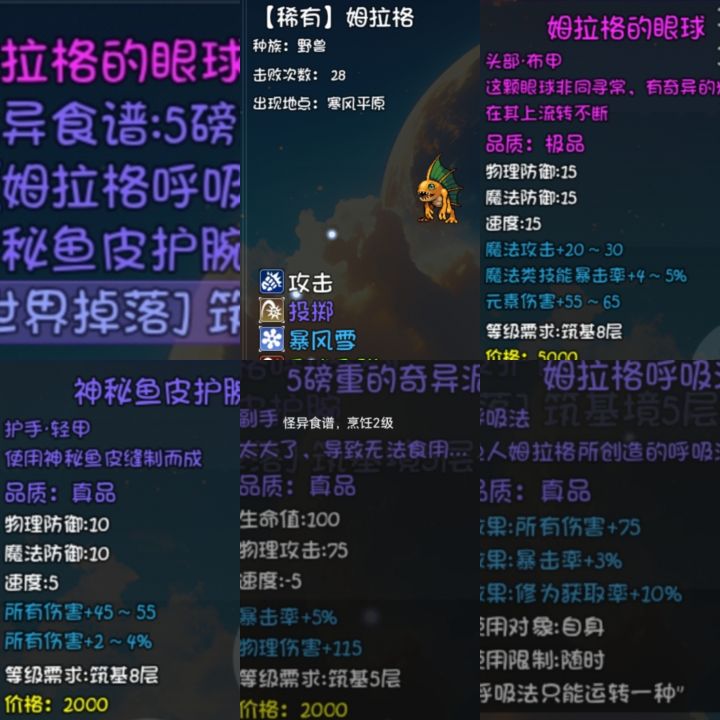 寒风平原钓鱼,感觉除了珍宝鱼剩下的都没啥用。宝箱: 武器:水手的硬头锤,八孔损, 防具:大地纹饰护腿,船长大衣, 心法:《鱼龙变》(前置心法《玄冰箭》在双溪瀑钓鱼宝箱出,技能白色《寒冰箭》在牛马村购买),会占用2个心法格子。钓了4组半才出了一本。鱼获: 蓝枪鱼,寒风鳕鱼,八彩鱼, 珍宝鱼:珍宝·急冻鱼怪物: 前所未见· 托纳格的闪电之足: 终末,托纳格的滑皮裤,《痛苦编年炒》