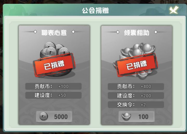 一、公会捐献建设度:用于工会升级,解锁更多成员上限;解锁更高级的远征副本二、奇门秘术(贡献币用途) (战力养成-奇门秘术-纯数值)贡献币来源: 公会捐献、盗匪悬赏、远征战场、公会探险(均为公会获取)贡献币用途:奇门秘术三、公会探险1、公会探险时间与自己VIP和公会成员VIP有关;2、探险时间越长,收益越高;3、加入氪佬公会吧!四、盗匪悬赏1. 每日可参与3次BOSS挑战,单只