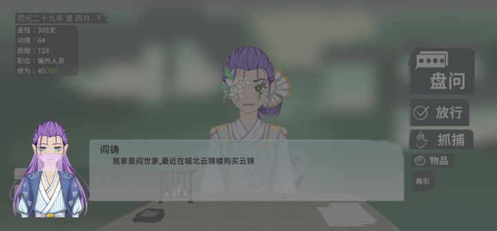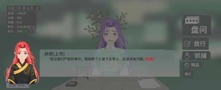 在当天结束而且出现剧情之后,并没有进入到休沐,而是停留在原本判断的界面,再点盘问就出现这样的对话框(甚至和正主是不同的打扮),选择放过之后就直接结算数量,没有休沐就进入第二天
