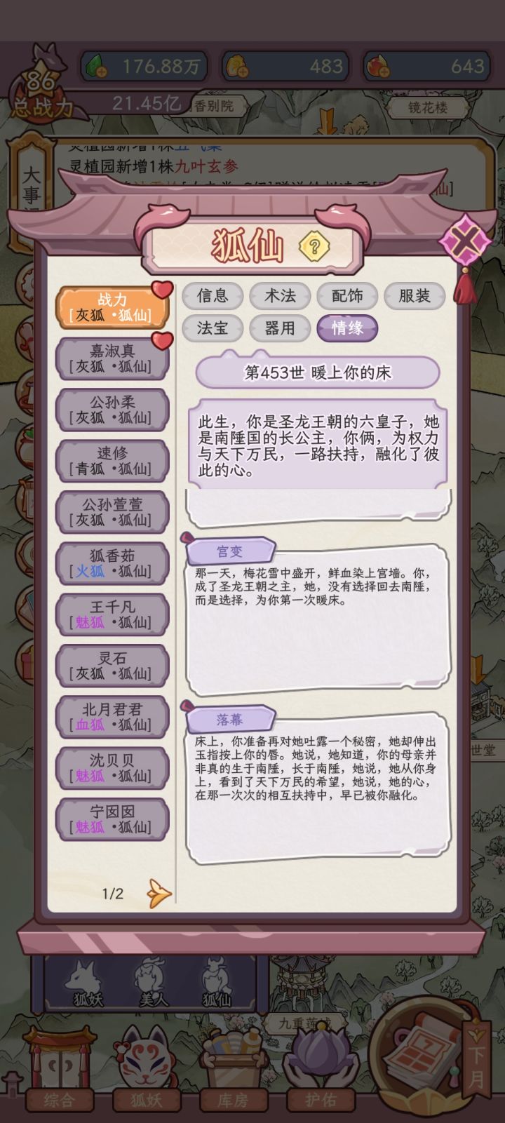 目前12.6小时,所有培养相关都已解锁,看了大概四五个广告。思路方面:选择走精英路线,狐狸尽量控制在10个以下,个人前面是6个,后面为了图鉴就稍微放宽了一点,方便事件集中以及稳定指点到。前期(地图上出现怨念怪以前)战力提升最大的基本靠泼水大战,优先拿带高等级活宝词条(紫色)。高等级小太阳(捐灵石的)前期遇到可以留一只。开局送的有一只带六边形的高战力狐狸可以当大哥养,遇到相关事件可以额外花资源翻倍