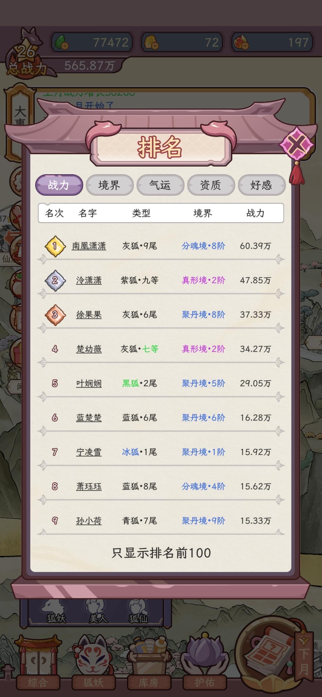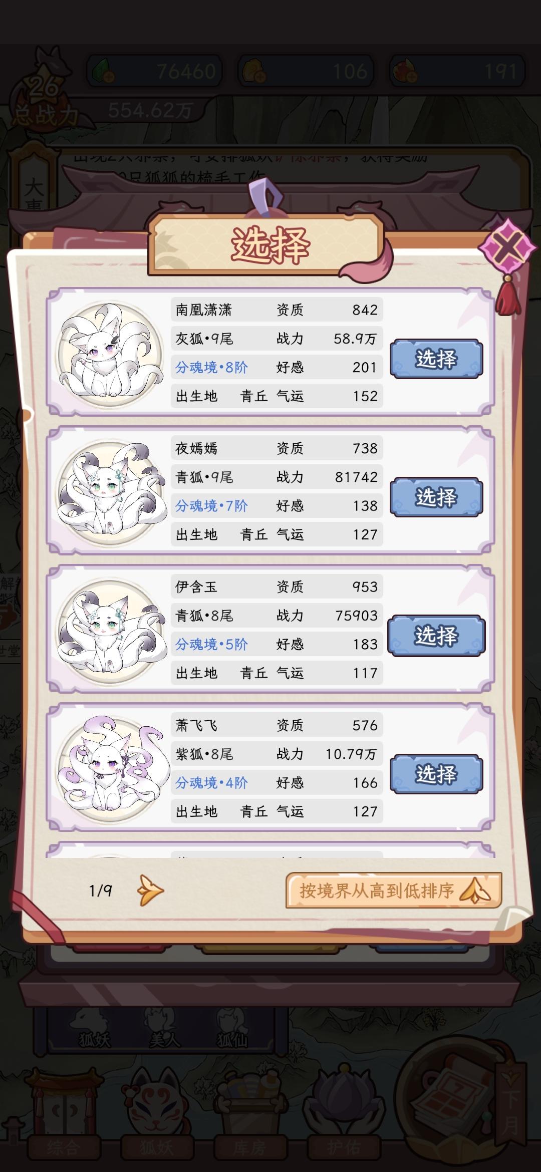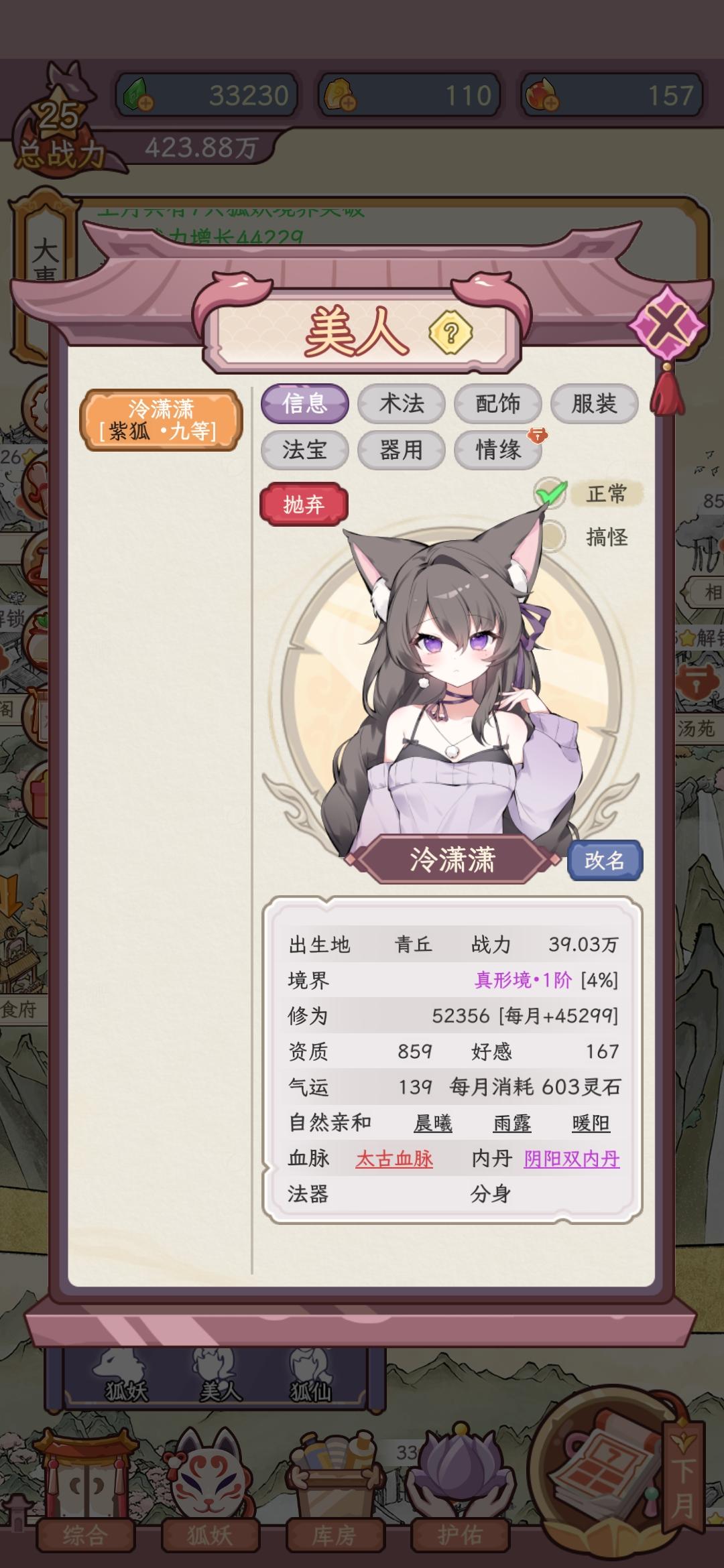 我个人玩了一段时间,发现养的狐狸越多,需要的广告越多,而且化形不是越早越好,因为,在有一段时间美人的培养方式还没有,纯是每天自己修炼,个人推荐还是每种狐狸各一只,不要像我一样养了70多只狐狸,广告已经看的烦了