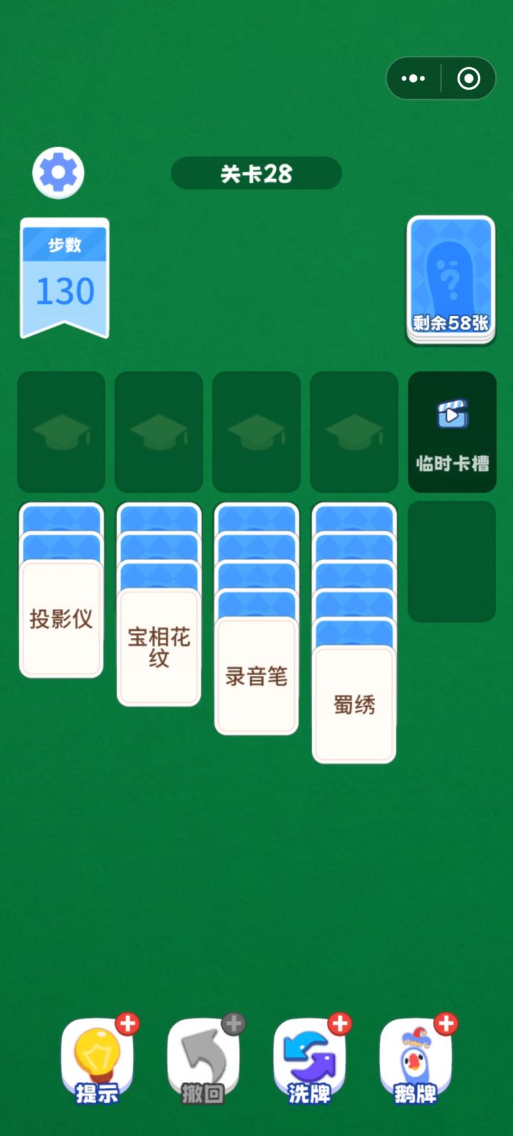 好消息:更新后二十三关可以过去了。坏消息:不看广告过不去的情况挪到了二十八关,下面十八张,上面五十八张,最少也需要一百三十四步,关卡限制一百三十步,根本过不去。