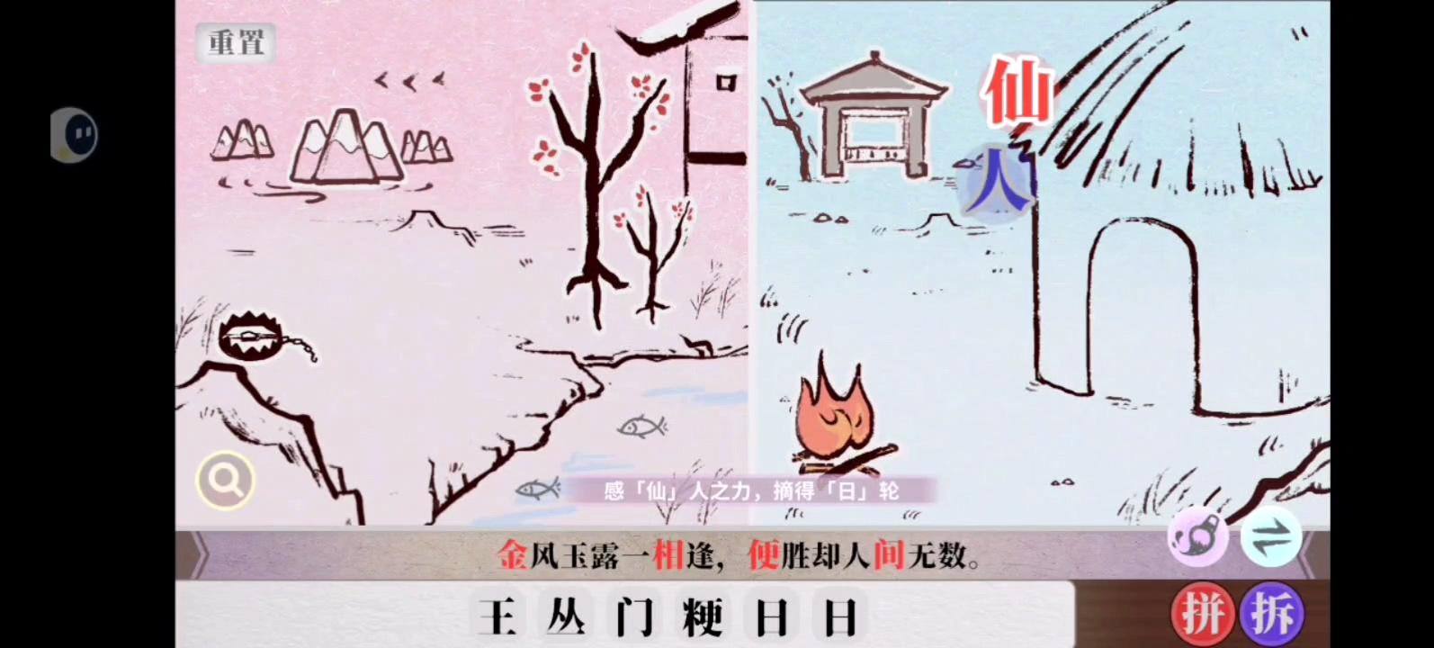 写这个帖子主要是帮助大家更好地找到字,通过关卡。以下按照可以找到的字和拆字、拼字的方法编排内容。其中红色箭头和圆代表左边的人行动,蓝色的箭头和圆代表右边的人行动1. 可以获得的字(春夏更替的方法)时欣童俗2. 拆字拼字的方法拆字拼字1. 可以获得的字在本关中一共可以获得下面这4个字1.1 春夏更替的方法在正式介绍解字攻略前,需要先介绍一下春夏更替的方法,因为有些字获得需要