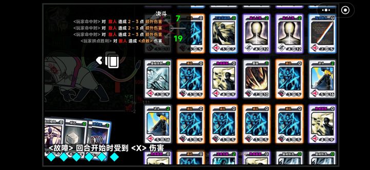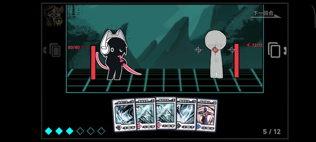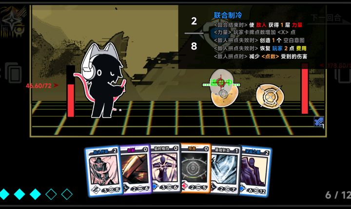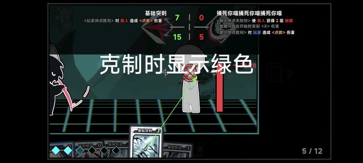 意图在对战中对方会出现意图,分为攻击意图和防御意图,攻击意图在回合结束时会对你造成随机点数伤害,使用牌时需要拖动到意图上才能使用,没有意图无法使用卡牌卡牌属性卡牌分为突刺(基础突刺)打击(基础打击)斩击(基础斩击)闪避(紧急闪避)防御(临时隔挡)这几类,属性在卡牌左下角可以看到,点击卡牌拖动到意图也会有属性投影卡牌克制突刺克制斩击,斩击克制打击,打击克制突刺,在克制情况下自身点数增加,对