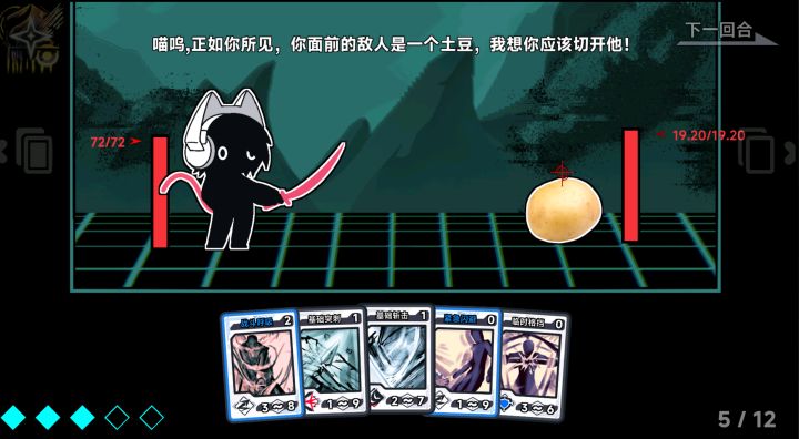 土豆作为新手的第一个对手,机制也是十分的“强大” 土豆一回合出现一个打击类型的攻击意图,可以用斩击克制,这里不过多赘述,主要是说一点冷知识 当你快速将卡片划到意图时,会出现灰色意图,可以看做闪避,固定3点。当手头上没有好打的牌时,可以试试这个技巧 当你开局抽的五张牌中,有一张斩击牌和任意一张攻击牌及可直接套以下模板:用除斩击的另一张牌过掉第一回合,然后用斩击过掉第二回合,然后再用悖论过第三回