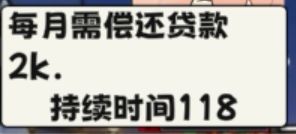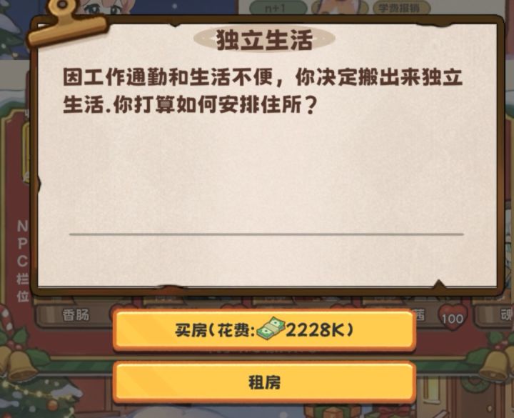 本游戏的租房机制常常成为萌新牛马们的噩梦,下面由圣女睦子米为大家简单讲解游戏内33岁会刷新图一所示的事件,初次出现时买房需要的金额约3333k(若点了局外天赋抑制通胀,这个价格会随之降低一些)。如果选租房会得到一个房租debuff,持续两年,如图二。两年后会再刷新选择事件,问是续租还是咬牙买房?每次刷新之后,租房和买房价格都会上涨,所以推荐尽早攒一小笔钱,直接买房。搬新家之