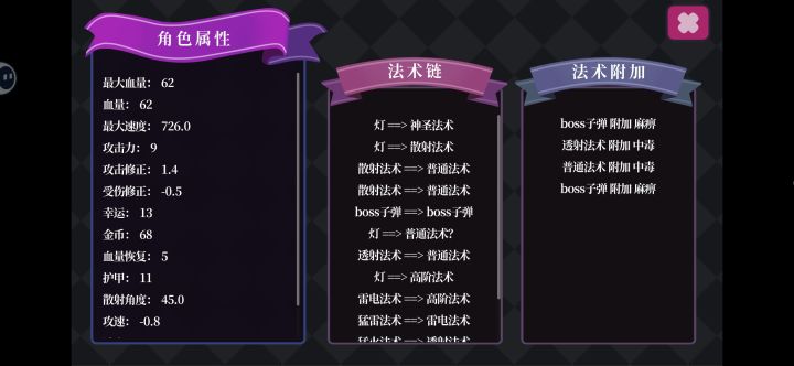 开局菜单篇在第一轮结束后,背包内存有普通法术*3+散射法术,可将任意法术融合成一个新法术(bug1),其原理为内存(序列号)相加。将初始4个法术全部融合,将会获得彩蛋法术:序列28:灯(bug2),根据作者详解“灯”在设计之初不曾考虑加入该法术。主角作为可爱的小僵尸怎么会死掉呢,即便血条没了“灯”也依旧挂在小僵尸旁边。在信息列表中,会发现铭刻的法术是通过“灯”来释放,若铭刻“灯”将会发现“灯
