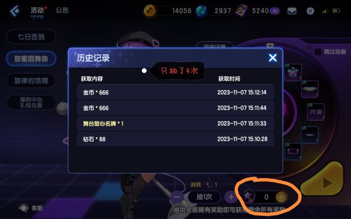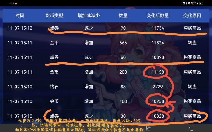 如图1,是点券购买记录,先后共计购买了6次唱片上次反映点券记录查不到的时候就说了,我先后购买了3次,分别花费30,60,90点券(我是买了就抽),共180购买了6个唱片(30点券一张,可以抽取6次),但是在最后一次购买的3个唱片后,我只抽了第一次,就出现同步中,整个界面无法点击,等同步结束,剩余2个唱片就没了,我以为卡的自动给我全抽了但是看记录也只有4次。如图2可见只有4次抽取记录ps:存在问