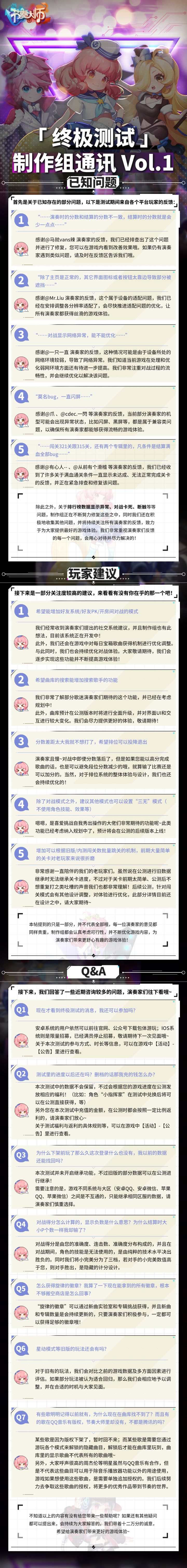 亲爱的演奏家们,大家好呀~距离我们的终极测试开启已经过去半个月之久啦,在这段时间里,我们听到了来自演奏家们许许多多的声音:喜爱的、不满的、期待上线的、分享体验的、反馈问题的、认真建议的……林林总总,不胜枚举,在此,制作组向支持着我们的每一位演奏家,致以最诚挚的感谢!另外,还有一声抱歉需要说给大家。服务器开启初期产生的BUG问题较多,尤其是在对战模式中,截止本周四的更新,我们已经陆续将对战模式中
