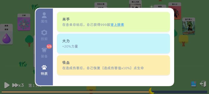 初始特质选紫色特质“锁血”(生命低于25%减伤50%),进化成骨精灵(骨粉那个),再获得一次锁血。。好了,你现在生命低于25%就100%免伤了,你可以开始玩了[表情_吃瓜] 注意:血量控制到25%以下后史莱姆离经验远一点,不要碰牛头的吸血羁绊和食人花的吞噬羁绊。同时,这游戏有三分钟平局机制,也就说你完全可以直接开始3分钟一天往前推,一路平过去就可以了。