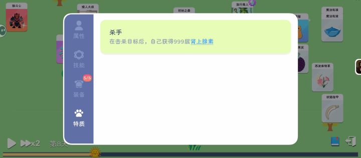 绿天赋肾上腺素干掉一个后其他怪停止读条你多读一次配合力速流派:骨头,黄金蛛丝,动物皮独狼万金油:紫水晶技能书拿物理攻击潜能主要用不需要的技能变力速也可以少量变血量提高容错成型之后打小怪一刀一个,boss理想情况两刀后开天赋偷一刀然后再打一刀再触发天赋进化之火优先变猫拿提速特质(猫先弄个鱼给它吃变蓝后按公式合成),二次进化随意