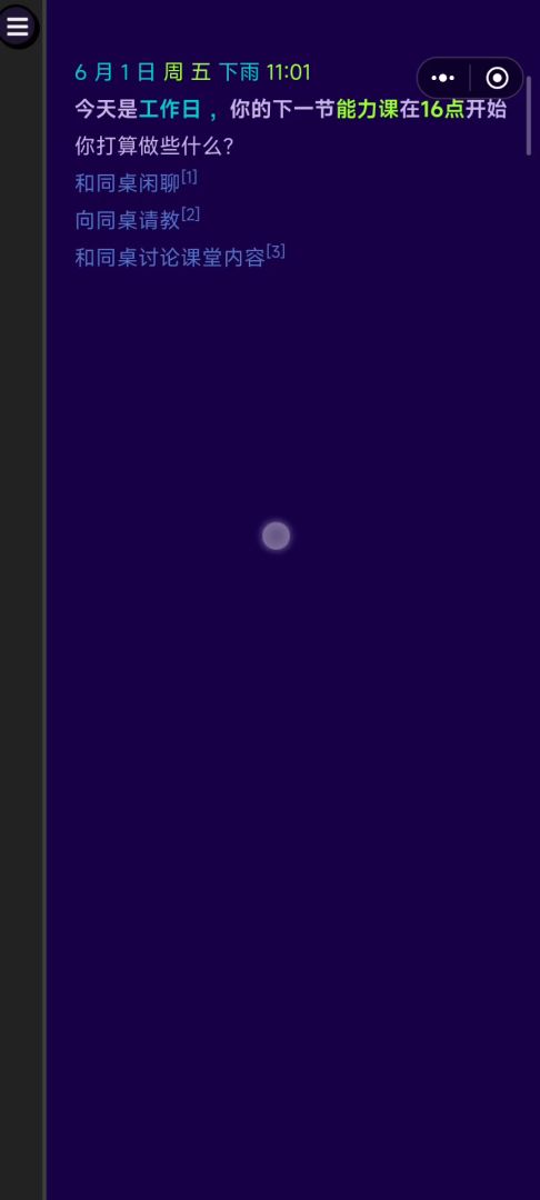 找到了一些bug和一些不知道是不是bug的地方。1.图1,8小时睡眠后这个好心情是还没写吗,手机也没办法分享给其他人;2.在书店打工的时候旷工的部分为什么是用负数的方式呈现呢?目前观察是每一天休息日都算两次;3.图2旷工次数为-8是因为正好到跨月,每月1号会自动回到周五,老师加油修复;4.图3图4是能力课除第一次溜去找语绘和闻常秋以外,会无法显示内容,不知道是还没写还是什么;同上条件,茗