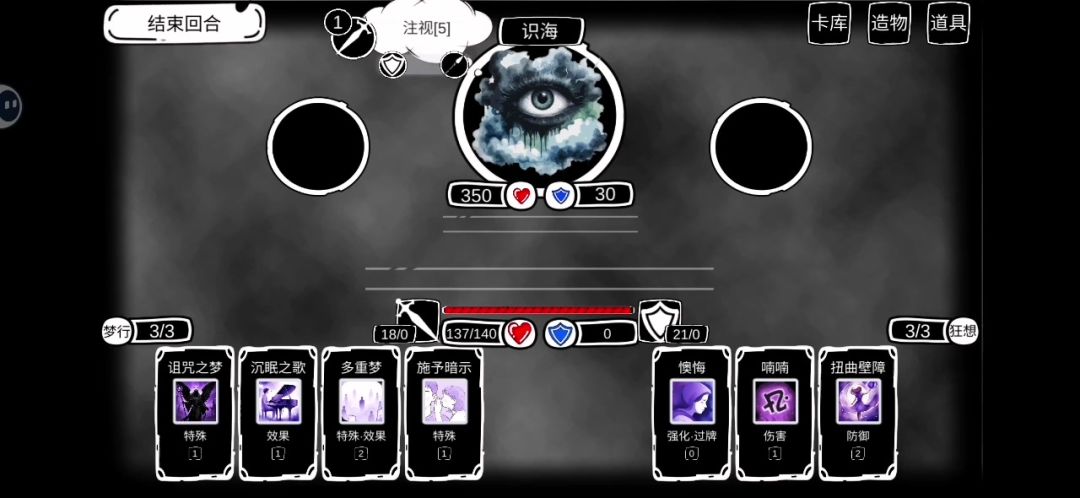 虽然1.4版本被削了,但我出问题玩不了1.4版本了 造物拿诅咒之梦(主输出)、忽然一梦(配合沉眠之歌前期清小怪和BOSS)、共时狂热(加能量、前期方便度过) 卡牌重点拿沉眠之歌(控制)、识海疏浚(降需要控制层数)、多重梦(叠编织数)、自我淡化(保命)其他看情况,癫狂基本什么都不用拿,原本叠盾效率就已经可以了 前期尽可能走战斗多的路线,多打战斗拿卡牌 (注:视频里的我初始有10点智慧,叠层速度翻倍了