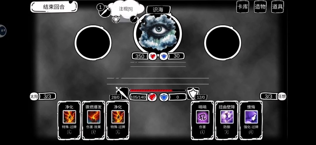 虽然1.4版本被削了,但是1.3未削版本也不我妨碍打识海 本打法核心是叠力量,打爆发 造物:可以拿疯狂末路(叠被动)、共时狂热(前期过渡)、毁灭化身(前期过渡)、属性强化(为了拿力量)、升格(叠力量),可以拿这几个[注:我不会玩太阳碎片,会玩的可以自己试试] 卡牌:[太阳]骤然爆发(主输出)、不落日(叠输出)、灼甲(上buff)、灼疗(回血,叠被动,清负面buff)、净化(抵抗自己的燃烧和抵抗对面