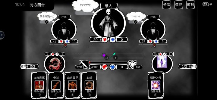 打死中间的社员触发纸人后,就卡在这里了,没有跳过对方回合,也轮不到我回合。游戏进行不下去了