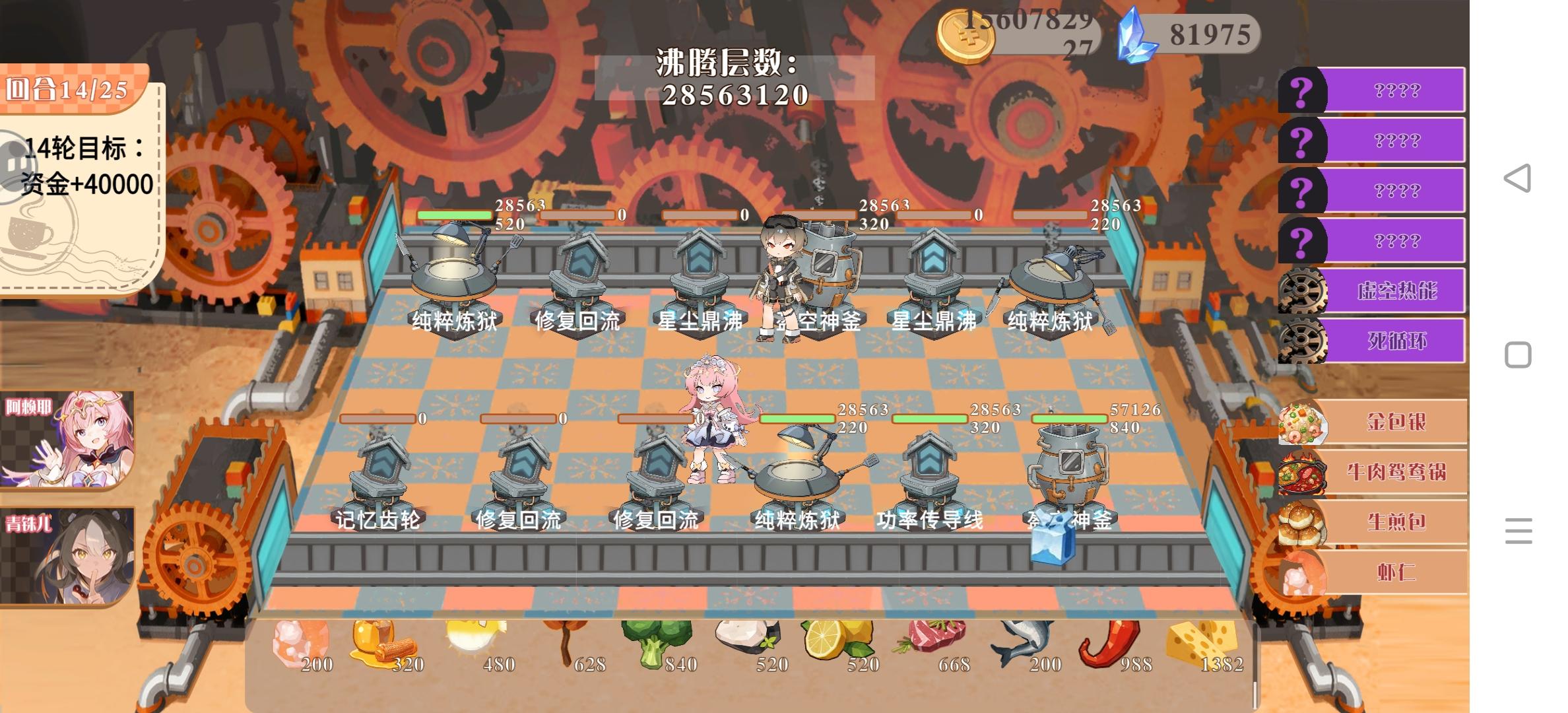 到图中这个时候已经沸腾到炸锅卡住了,非常可惜,没体验到负值收入的魅力。首先5星好评,再提一点个人建议吧:1.建议对人物bug牌库做一个简要展示/说明,这样选人更有针对性。2.食材/菜单库和厨具,bug库分开会不会更好呢?虽然目前游玩时间还很短,但是牌库刷新体验不是很好,有时候很容易出现刷了食谱但是半天刷不到食材的情况。3.还是肉鸽流派上的问题,针对蒸炸煮三方面的区分度说实话体感不是很大,比