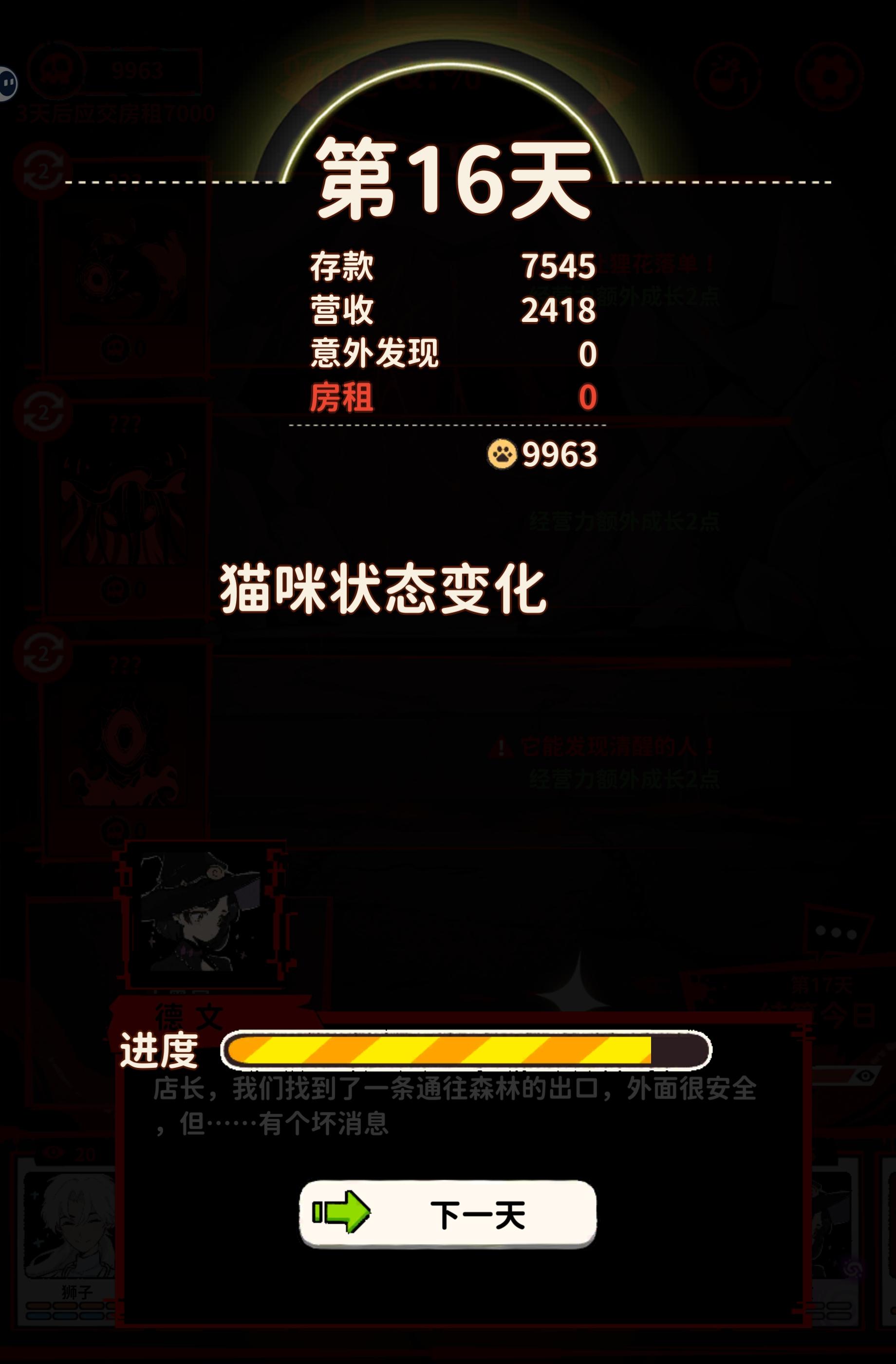 影子鬼的相关描述文本偏差,影子鬼只是精力不会下降,不是永远满格。另外是橘猫会出现明明不在第1个位置,但是仍然显示正常营收能力并按照在第1格时结算了精力和收益,触发原理不明。游戏目游戏目前结局玩法较少,建议增加更多结局或成就。可以开发更多机制不同于影子鬼的boss,影子鬼也可以设计成被不停的抓走轻生或重伤等等折磨时也可以达成特殊通关结局。包括全体猫咪清醒通关,或者全体不吃药丸通关这些成就都可以考虑