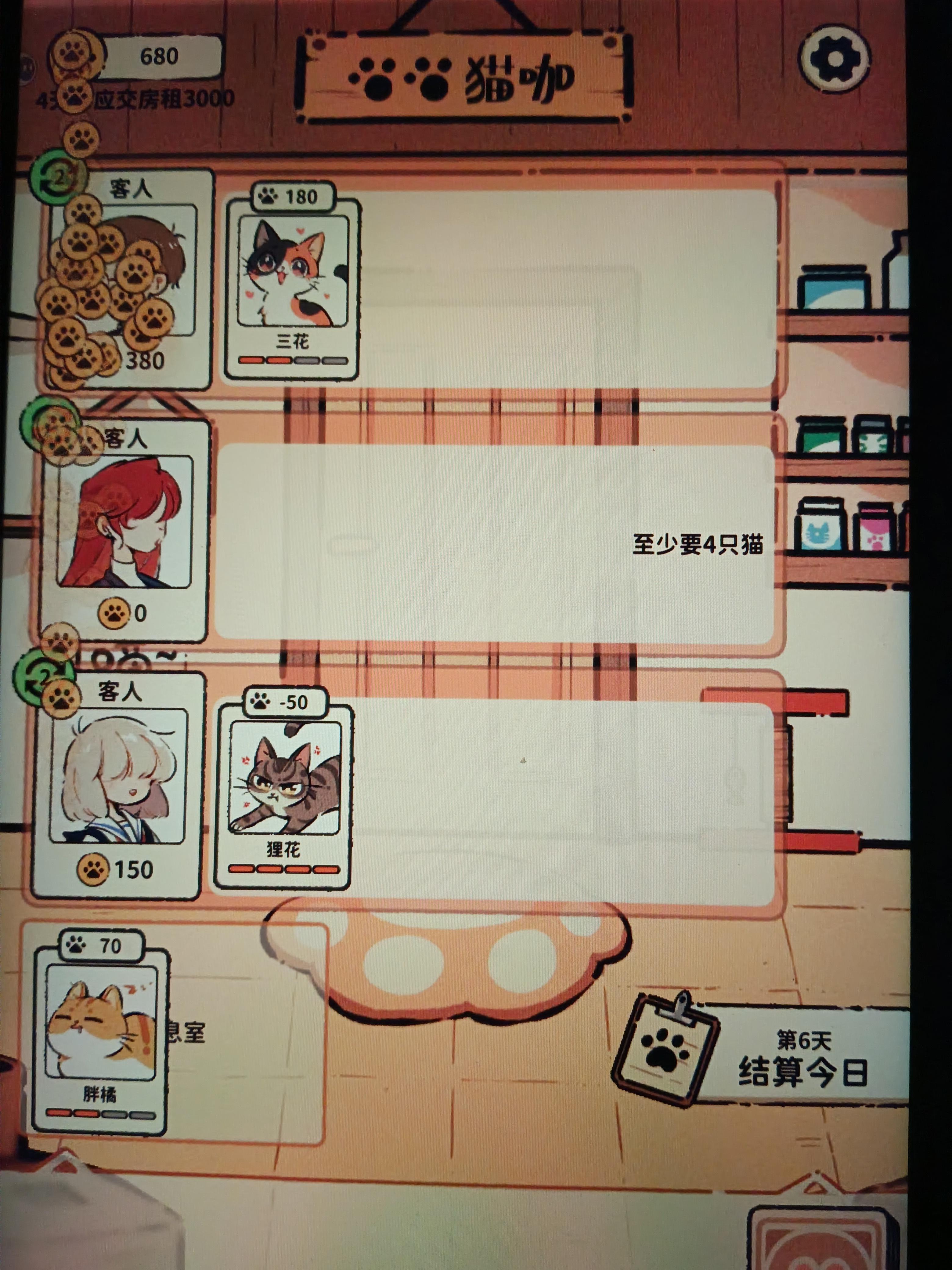 点了几遍,日期金币都没有反应,就只有个金币入账的特效啊,卡死在这里了,,bug?(还有猫猫进入疲惫状态怎么处理啊?#猫咖怪谈