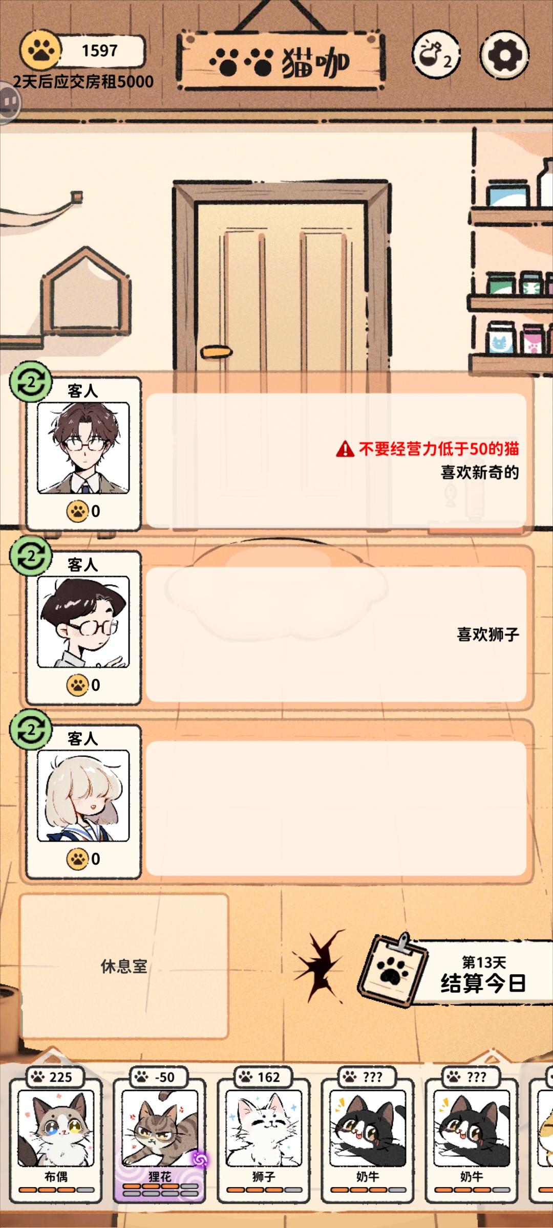 就开了两局,每次玩的时候点那个结算就有概率会卡住没反应,然后就一直卡在那里点什么都没用,点主界面直接重开存档都没有😠破游戏一局都结束不了#bug反馈 #猫咖怪谈 我用的是华为手机