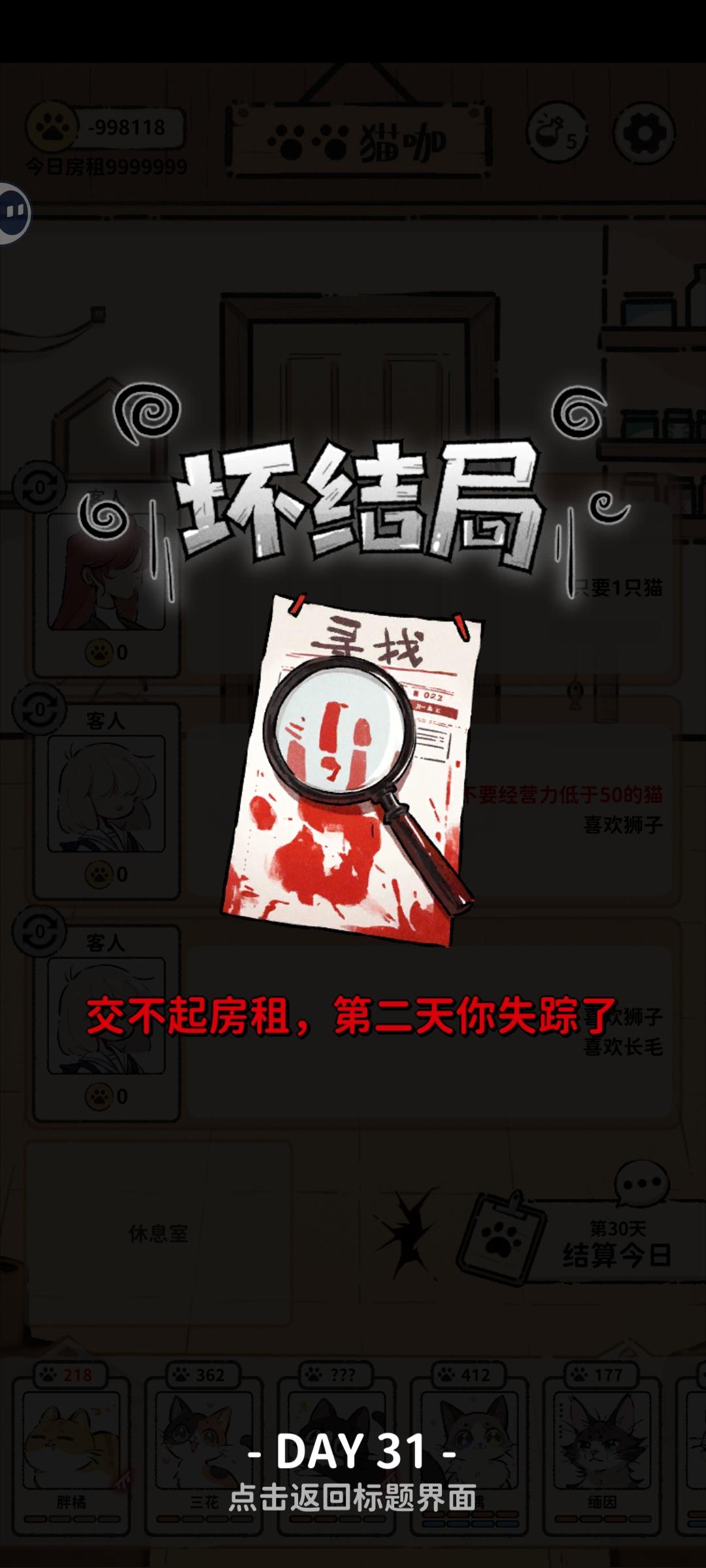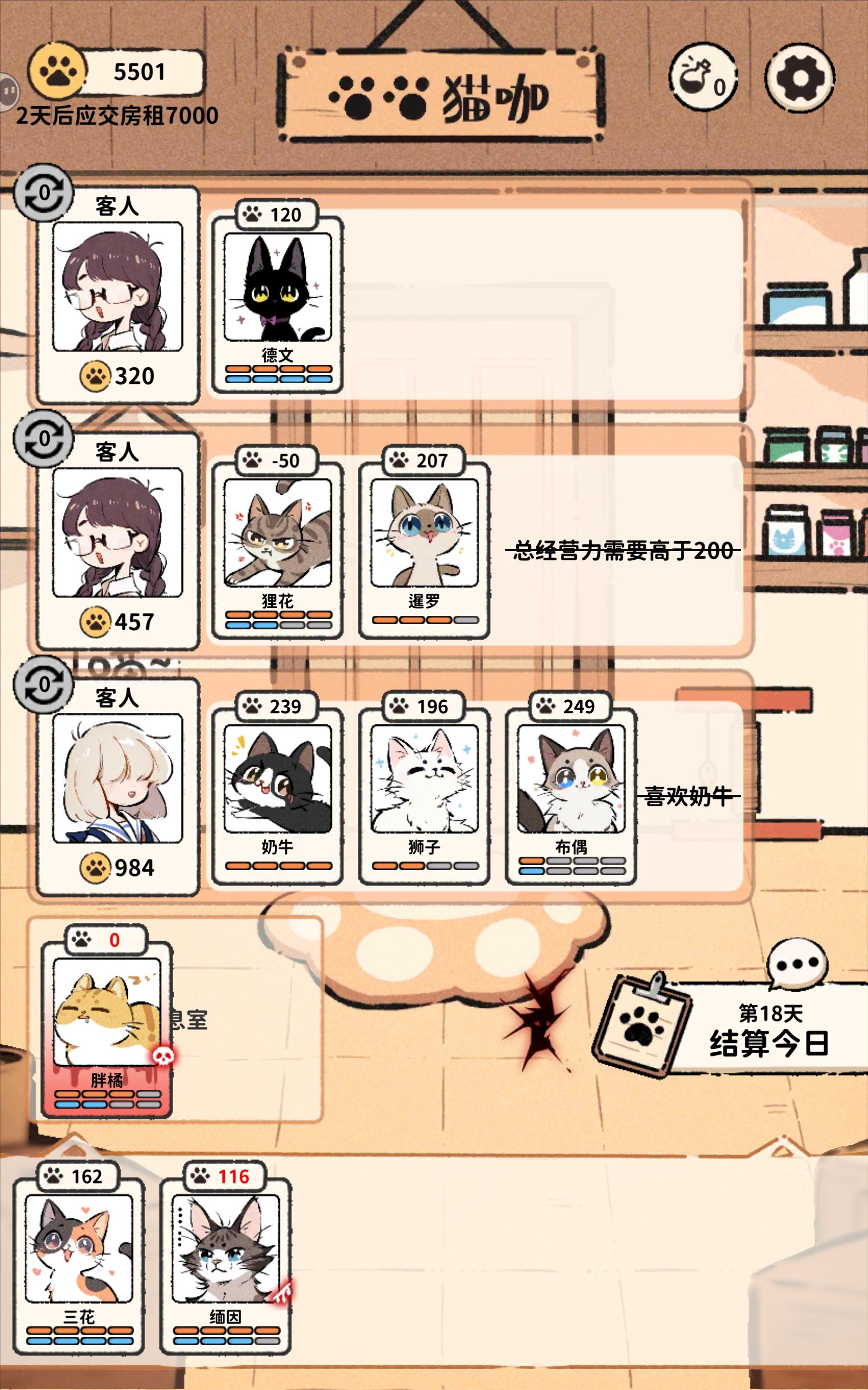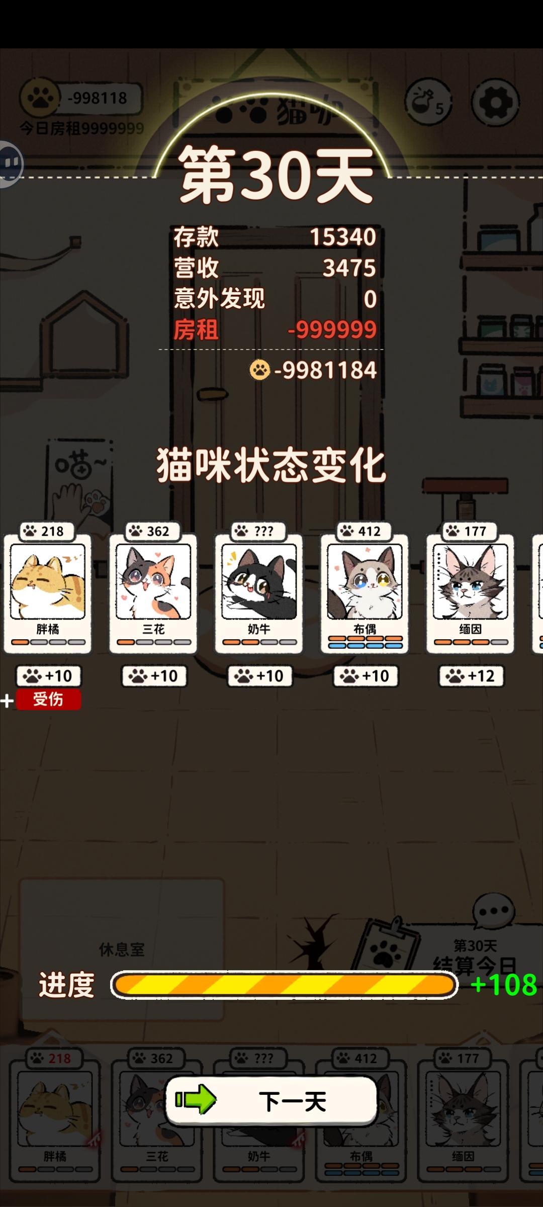 就是一直在重复同一天,天数不更新,但是钱加了。因为我的三花当时有个癫狂buff本来是准备隔离的,但该死的红字最后刷出来不让三花落单,我只能让胖橘陪她。结果点第二天天数不变没刷新直接又结算了一边,我胖橘被搞成重伤了。#然后本人不死心又点了一次结算,如图我的三花明明两天的癫狂buff没了,但是我的缅因在她旁边呆着还是被搞受伤了。呜呜呜呜呜呜呜呜,求放过我的猫猫,一定是影子怪搞的鬼。#猫咖怪谈