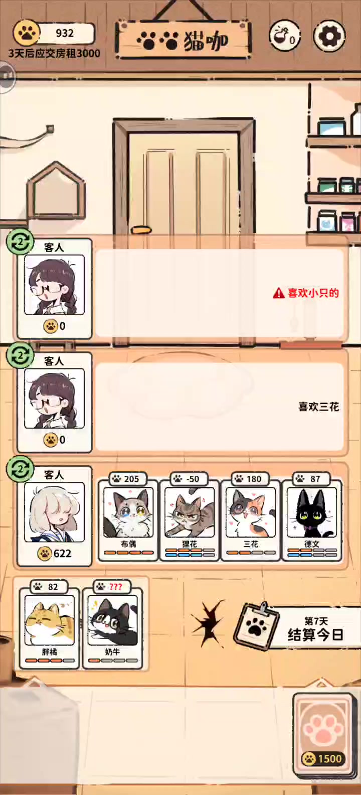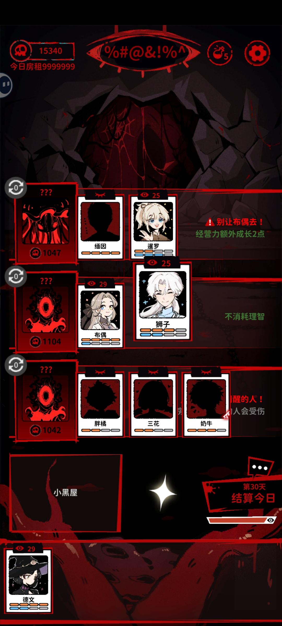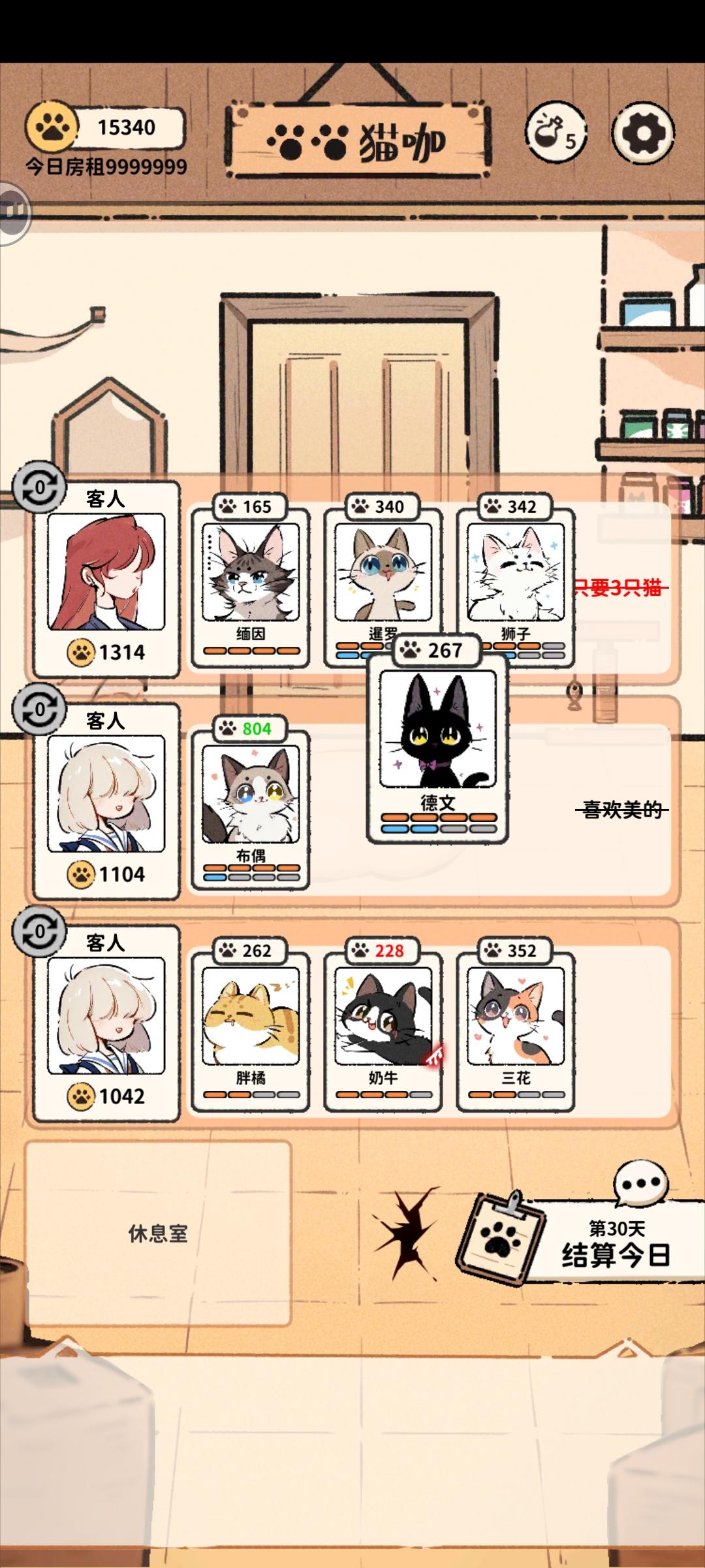 就是一直在重复同一天,天数不更新,但是钱加了。因为我的三花当时有个癫狂buff本来是准备隔离的,但该死的红字最后刷出来不让三花落单,我只能让胖橘陪她。结果点第二天天数不变没刷新直接又结算了一边,我胖橘被搞成重伤了。#然后本人不死心又点了一次结算,如图我的三花明明两天的癫狂buff没了,但是我的缅因在她旁边呆着还是被搞受伤了。呜呜呜呜呜呜呜呜,求放过我的猫猫,一定是影子怪搞的鬼。#猫咖怪谈
