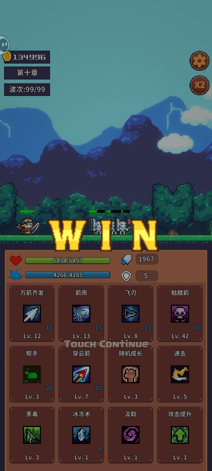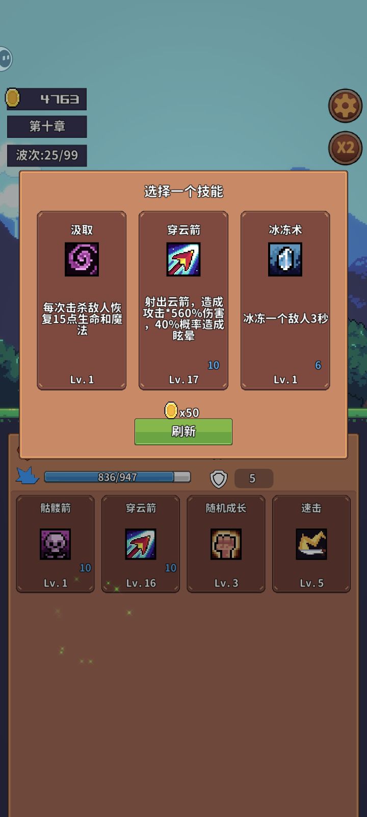 开局骷髅箭一级就足够了(主要用来等穿云箭技能刷新,哪怕到了99关,一级的骷髅箭召唤的小骷髅也能抗两刀) 第二关优先穿云箭意味着可以无伤打通十章(包含本身的攻击乘以百分比伤害,且每升一级加百分之三十的伤害,包含穿透,晕眩和百分比伤害) 次一点随机成长(满级3级,每过一关随机生命,魔法或攻击加3点,主要看中加攻击,可以配合穿云箭的百分比伤害) 从第三关开始有随机成长就拿到满级3级,一级的穿云箭和