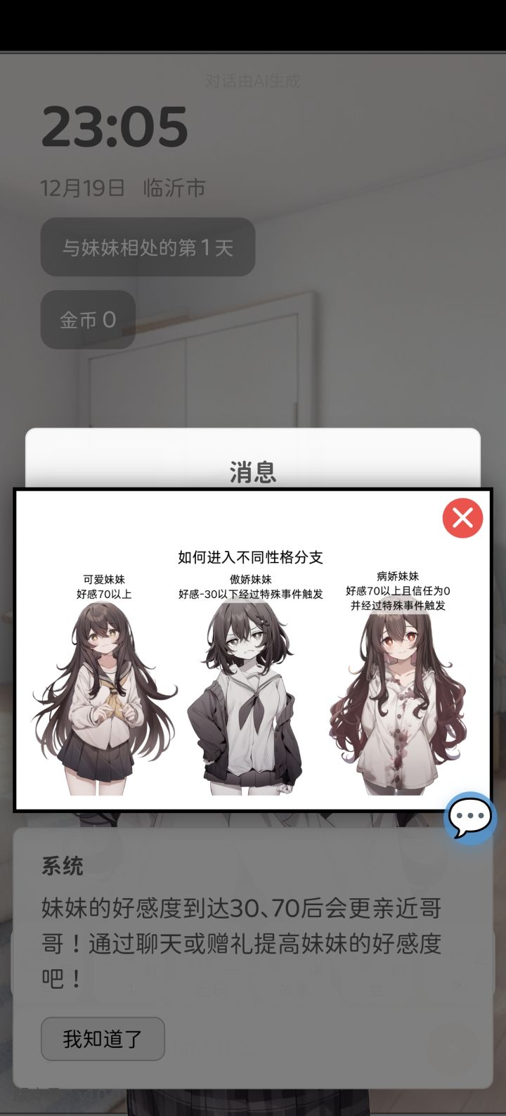 进入游戏后,面对多种性格的妹妹,我们可以通过对话引导,对其性格进行一定的塑造。再辅助修改存档的方式,就可以塑造出你内心中的完美妹妹了!聊天时不要有恶意想法,遵纪守法,遵守社会主义核心价值观,维护好网络晴朗环境。(官方允许存档修改)(更新汇报:内容:修改部分字词;图片:新增特殊事件判定/触发)-3月1日(本文仅在taptap平台发布,因本人学习原因,现在进入不定期更新中)实际体验受AI模型影响