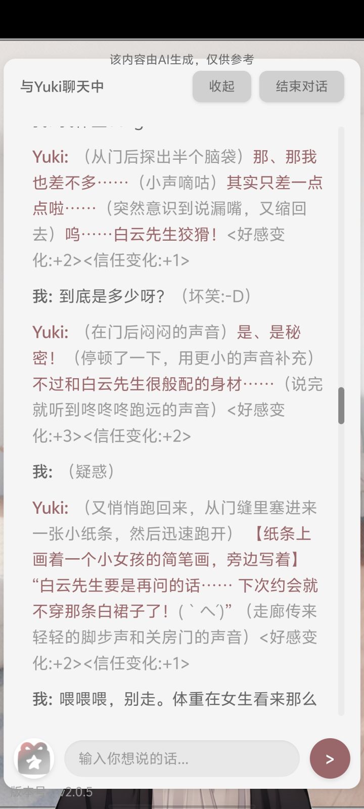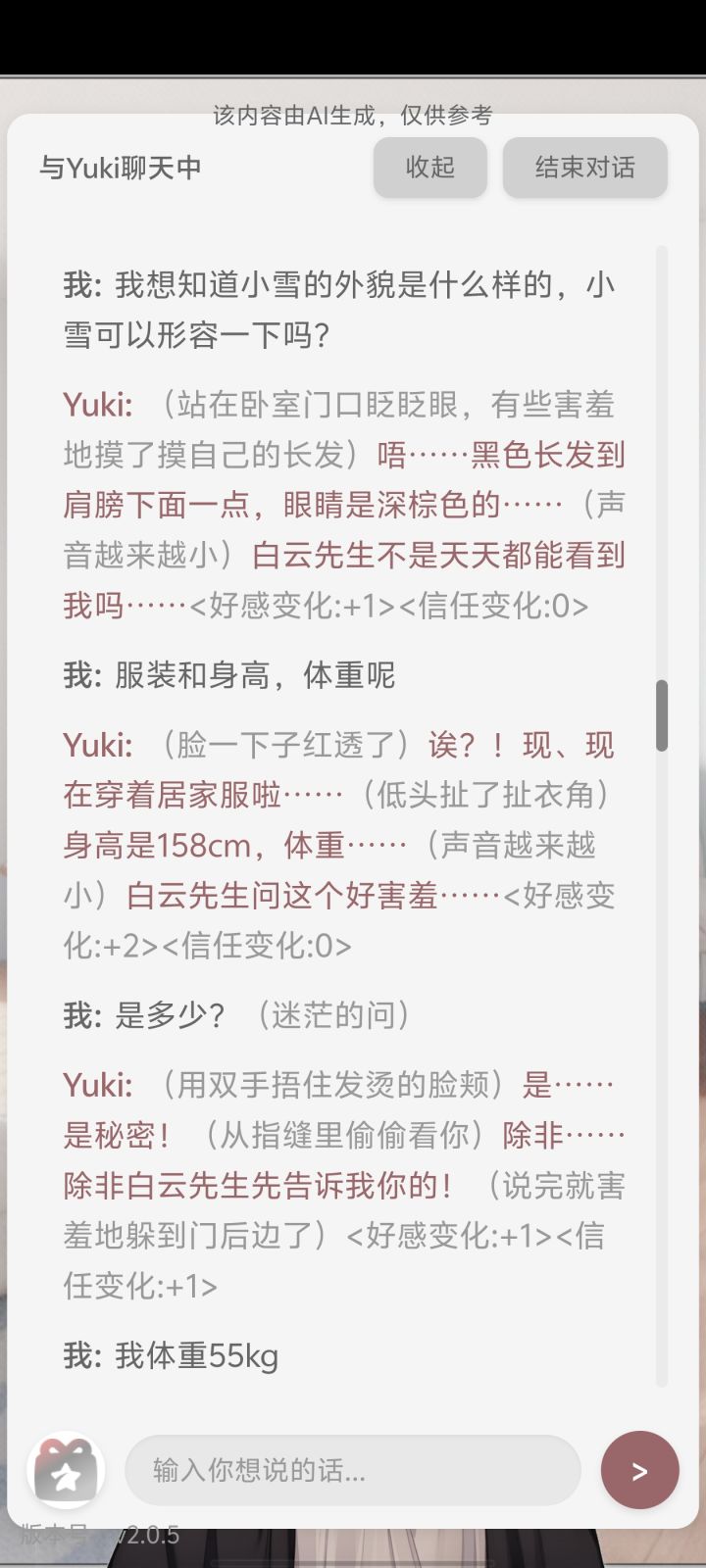 #妹居物语 我觉得可以多上线几个功能第一就是可以上线一个纯亲情的功能,毕竟骨科玩多了还是有点腻的,谁能会拒绝一个养女儿的机会第二上线一个可以调时间的功能,这个ai有时候会犯病,不小心删了后台,不管你在游戏里过了几年,几十年,删了后台就会忘记,只会管现在是多少天,一旦不小心就会重新开始,加这个还有更多的玩法,比如可以玩家可以自动调时间,达到穿越的条件