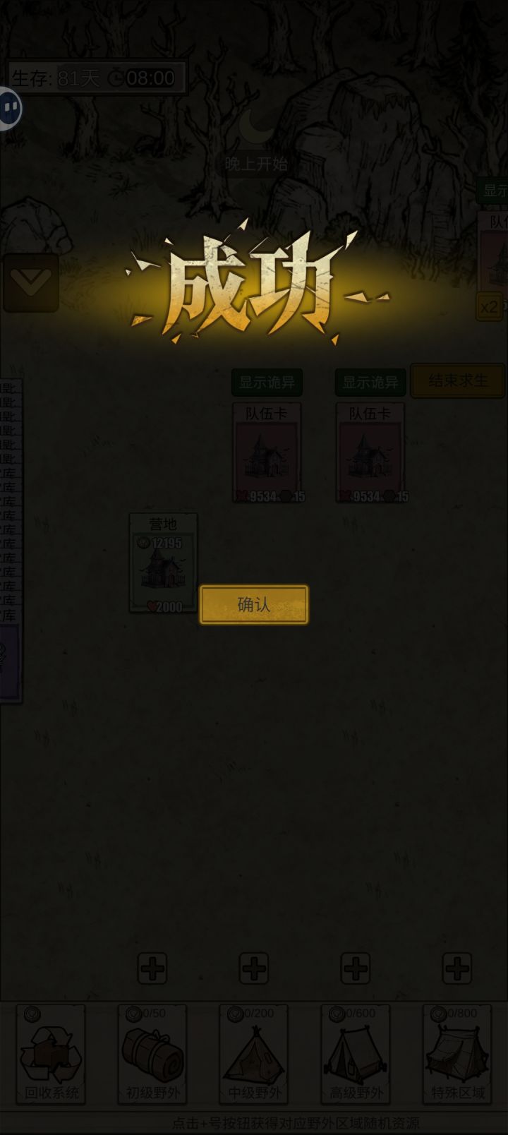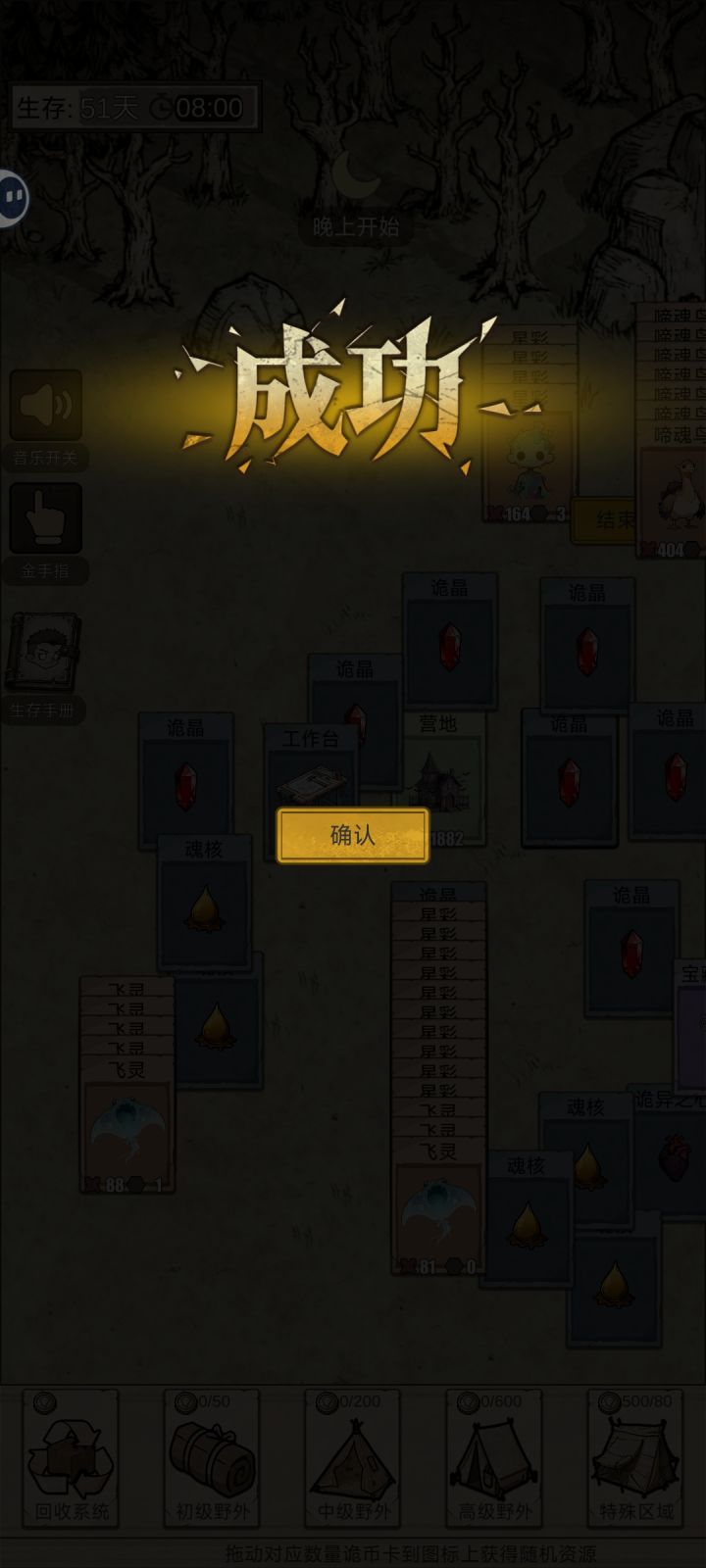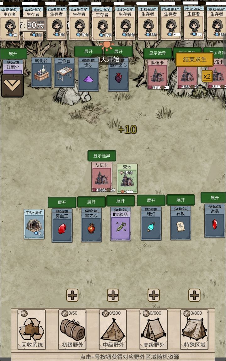 结尾含作弊法基础了解:游戏主要通过堆叠卡牌进行行动,主要人物为【生存者】,在【诡矿】获得【诡币】,使用诡币在【野外】兑换资源,获得【祭坛】。靠自动恢复或通过【诡晶】恢复生存者的【探索度】,消耗探索度在【祭坛】进行收容,从而获得【诡怪(统称)】。并在夜晚使用诡怪战斗,战斗胜利获得物资,失败则减少营地生命值,营地生命值归零游戏失败,未被攻破的情况下存活五十天后获得游戏胜利。诡怪介绍:游戏开