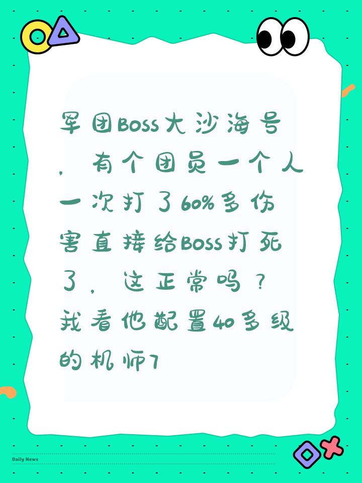军团Boss大沙海号,有个团员一个人一次打了60%多伤害直接给Boss打死了,这正常吗?我看他配置40多级的机师7.8星的机体。我们团长60级,9星机体打两次才12%