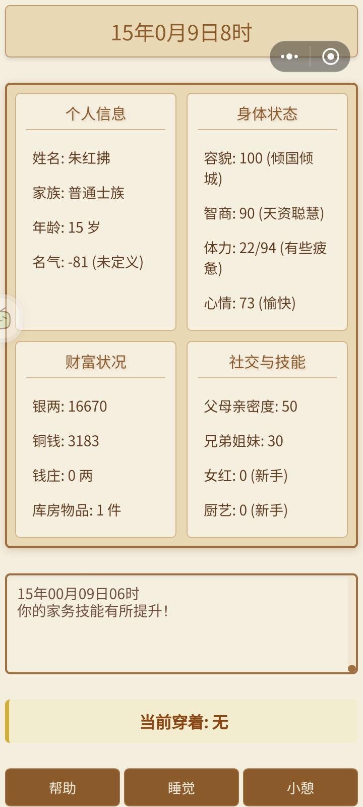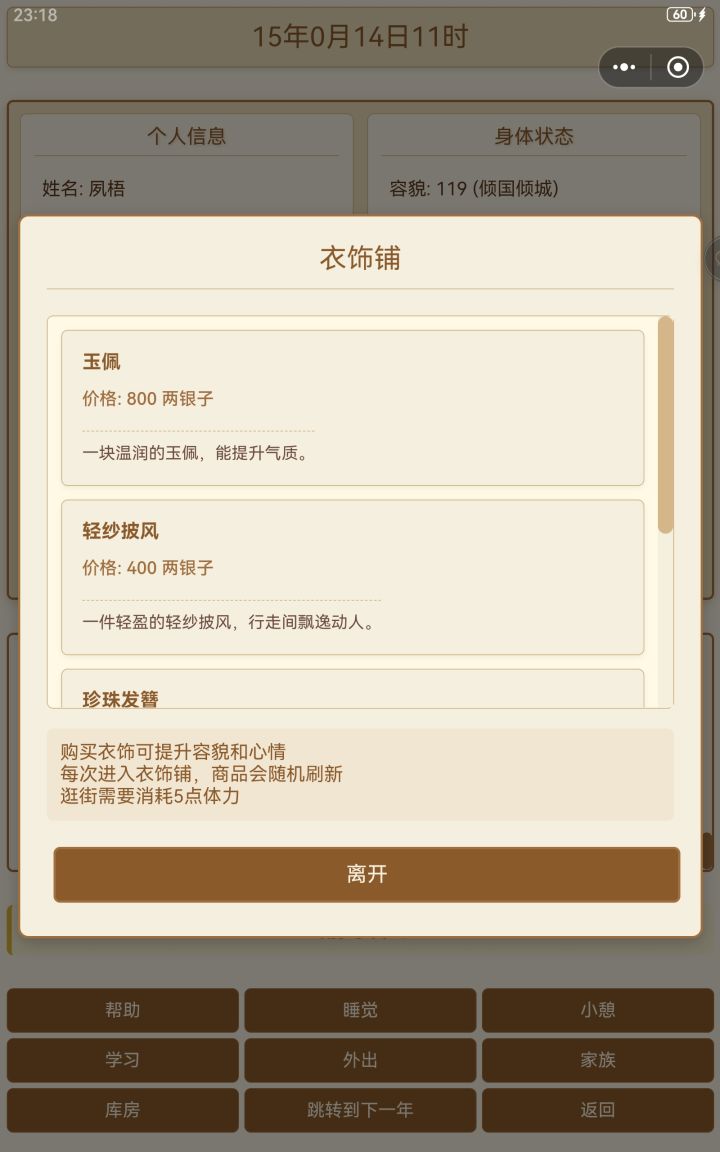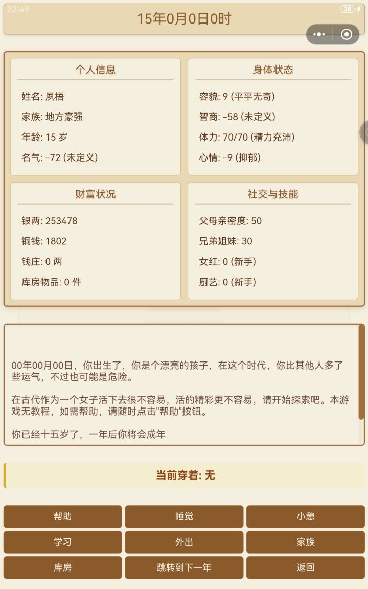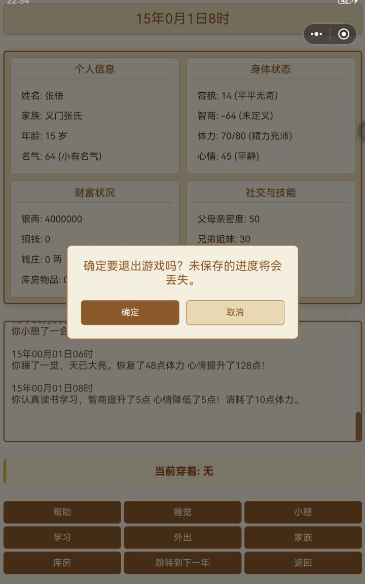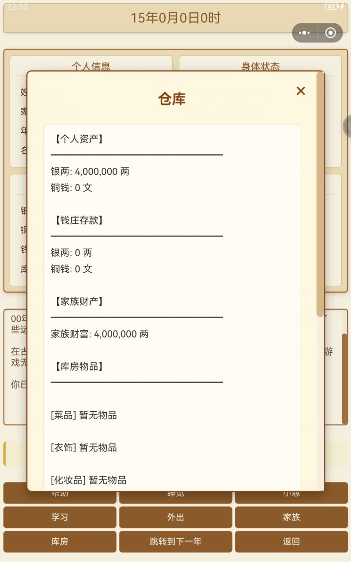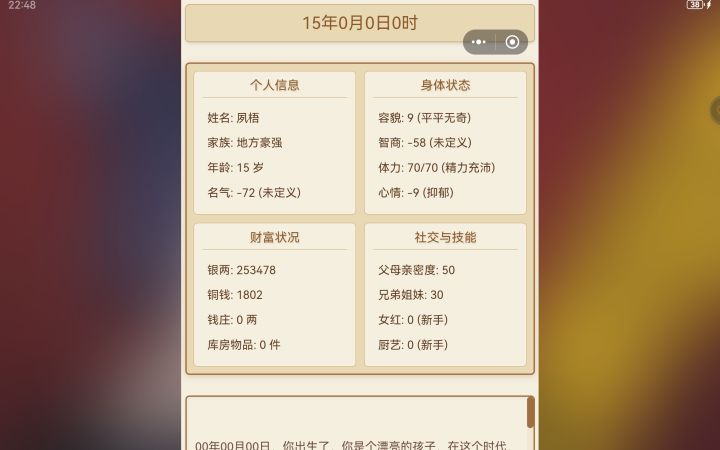 第一个,平板横屏画面缺损且不能滑动。第二,可以滑动的地方不能动,比如仓库和商店。第三,帮助里说有那么多技能,但界面只能看见女红和厨艺的属性。第四,无法与家族成员沟通和互动。第五,厨艺不知道怎么增加,没有体现。第六,返回键那里点了取消依旧返回封面。第七,睡觉和小憩可以弹个窗口提示,有时会误触。目前就这些。