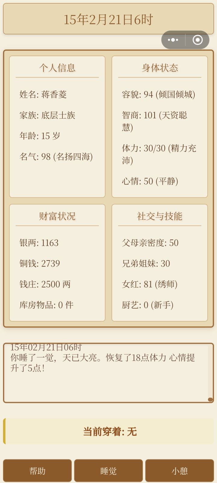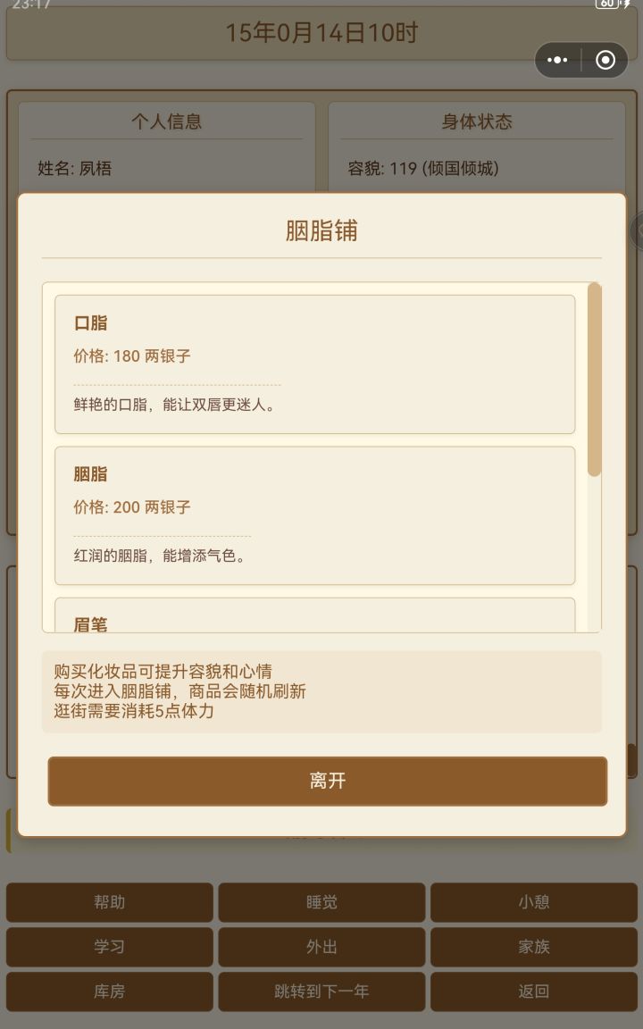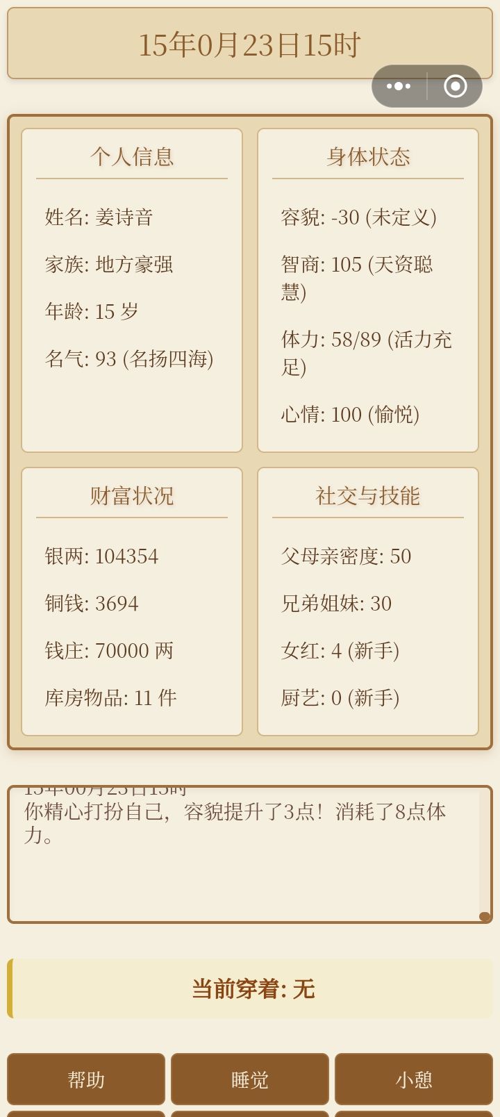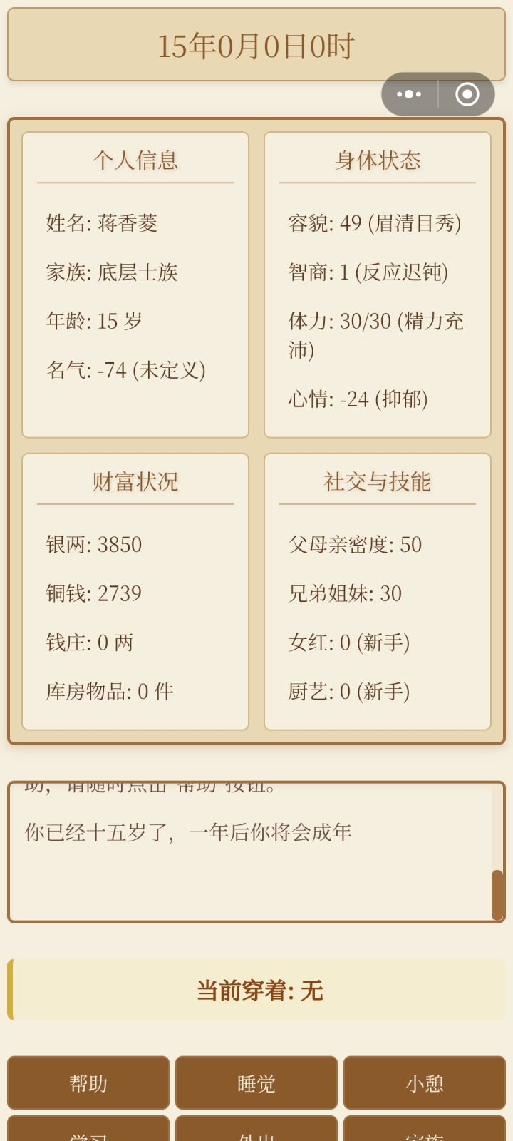 第一个,平板横屏画面缺损且不能滑动。第二,可以滑动的地方不能动,比如仓库和商店。第三,帮助里说有那么多技能,但界面只能看见女红和厨艺的属性。第四,无法与家族成员沟通和互动。第五,厨艺不知道怎么增加,没有体现。第六,返回键那里点了取消依旧返回封面。第七,睡觉和小憩可以弹个窗口提示,有时会误触。目前就这些。