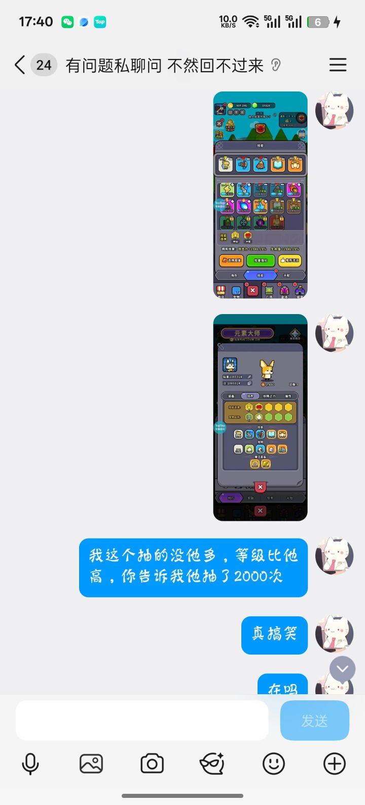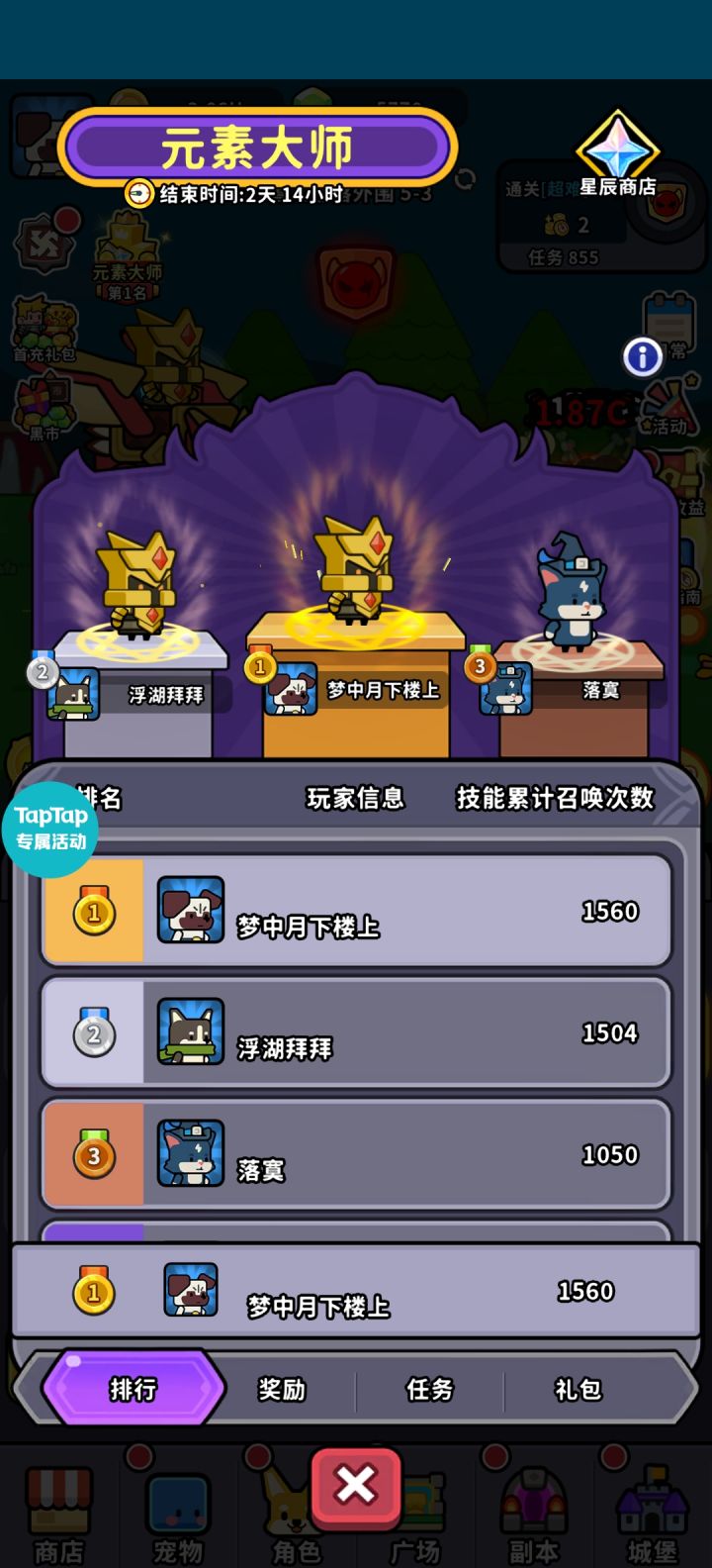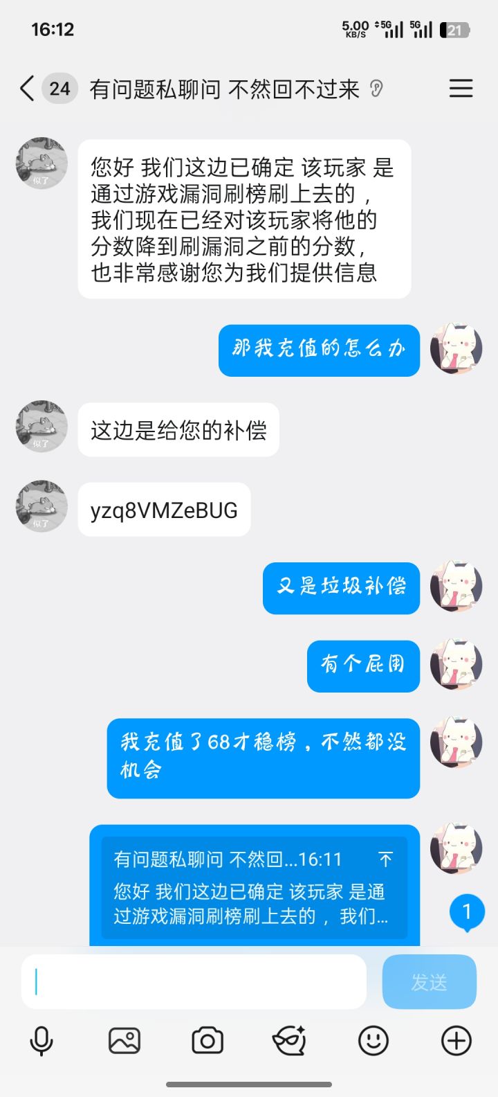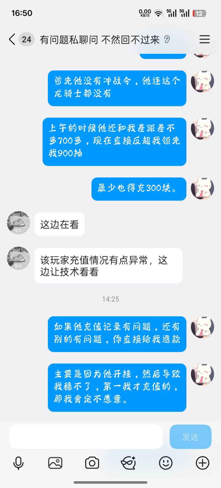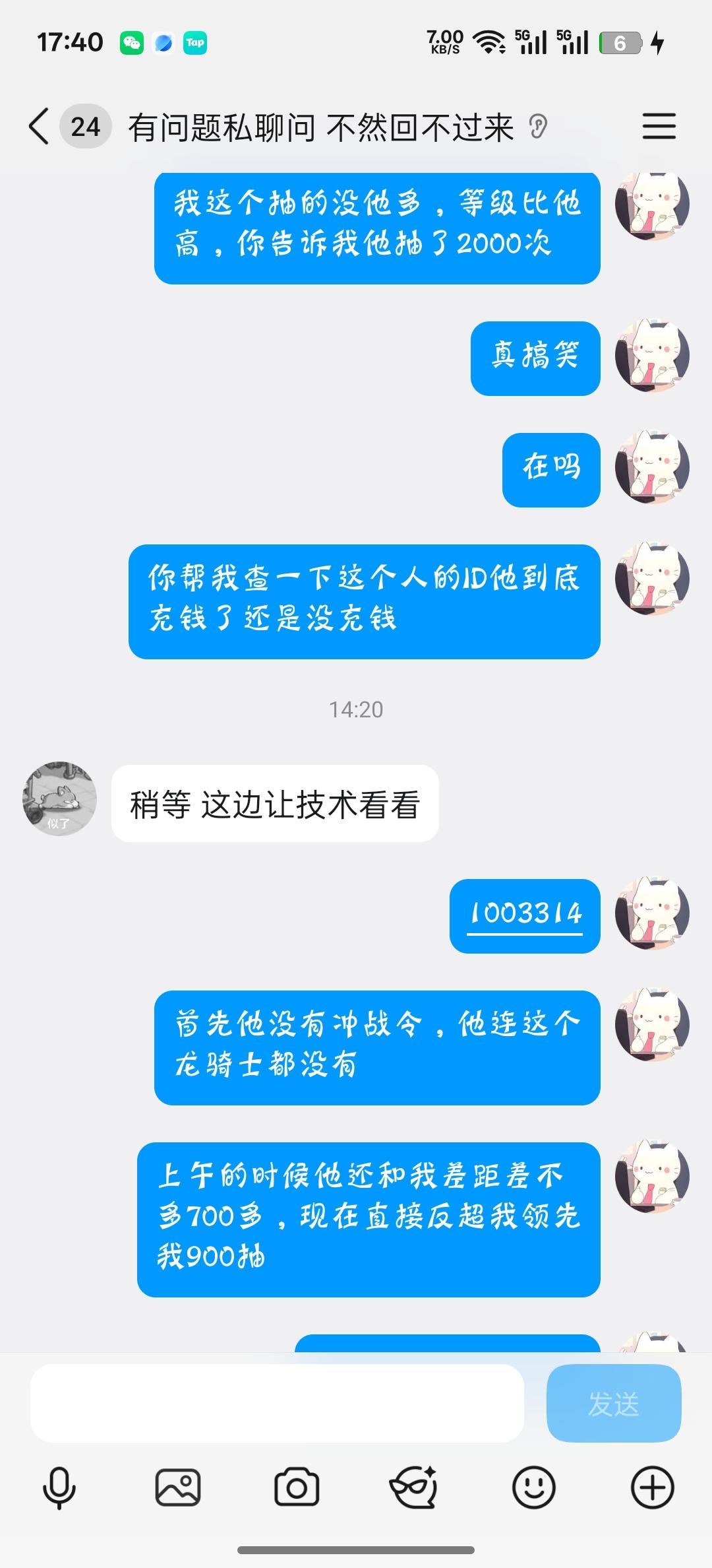 我的ID叫梦中月下楼上,然后那个玩家哥,在短短10个小时之内反超我900,之前从来不在榜上,如果正常充值,最少也会充值一个龙骑士,他连龙骑士都没有,他直接占领了元素榜单第一 ,然后我保持疑问,就询问了客服,然后他说他充值异常,只说了和技术沟通,我就当是他们的技术可能不太行,因为我当时我等了挺久的因为这个结算是在下午2:35左右,我没办法为了维持自己的榜一,我又继续充钱了,最后他告诉我那个人数据重置